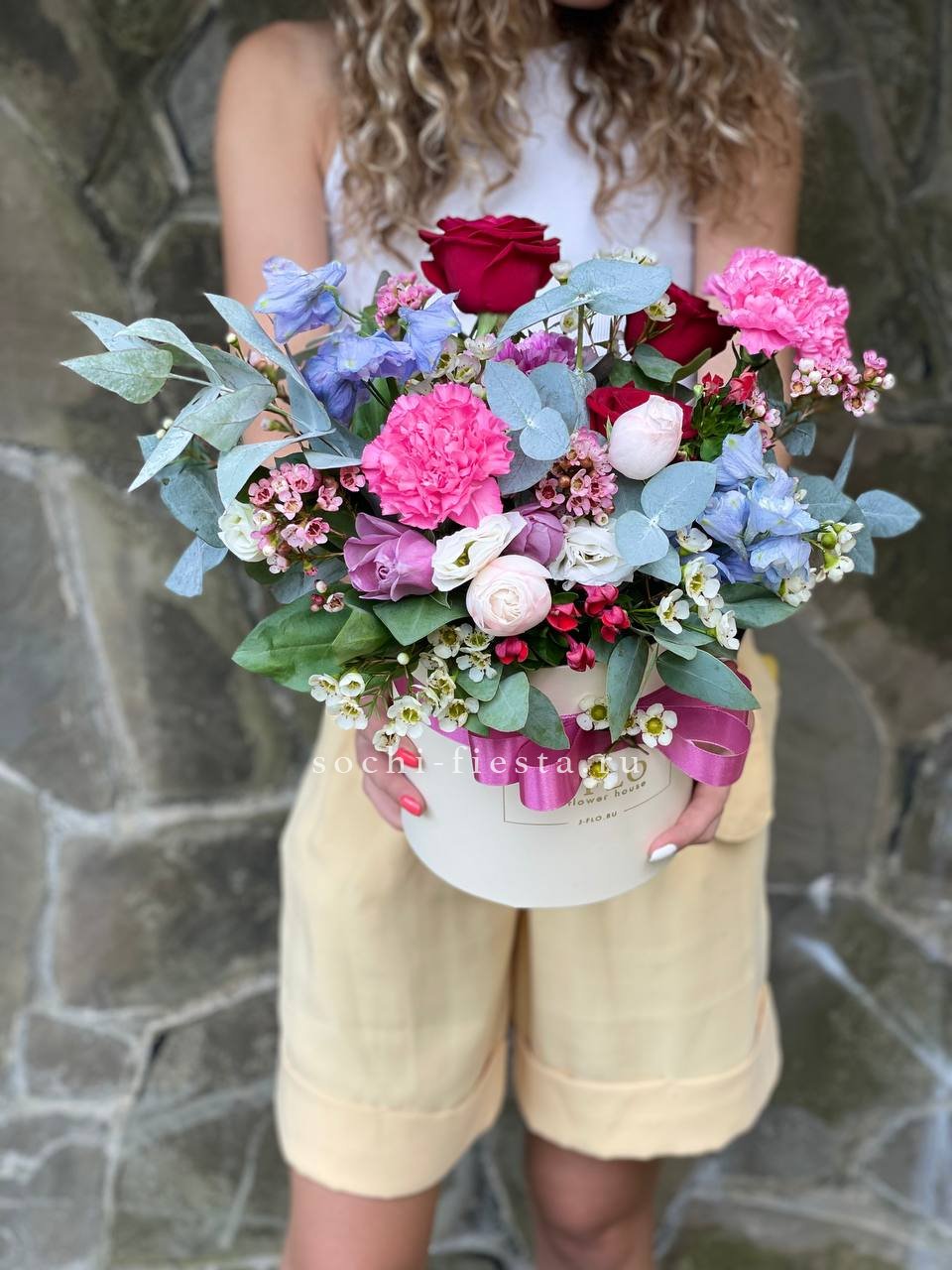 Белоснежные розы переплетаются с воздушной эустомой и раскрытыми лилиями в аккуратной цветочной сумке. Эвкалипт создаёт прохладный фон для светлых бутонов. Композиция на оазисе сохраняет свежесть и форму долгое время.