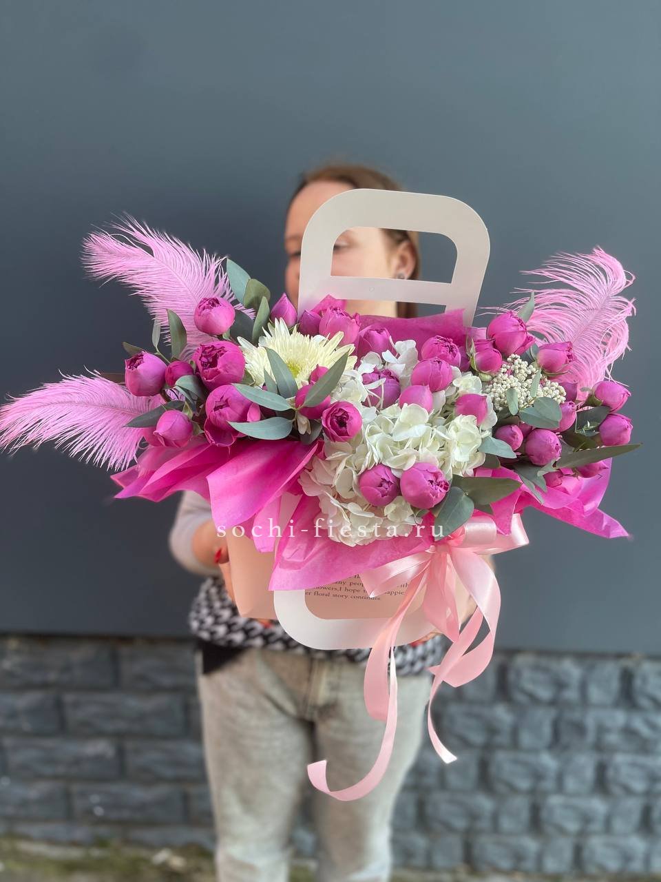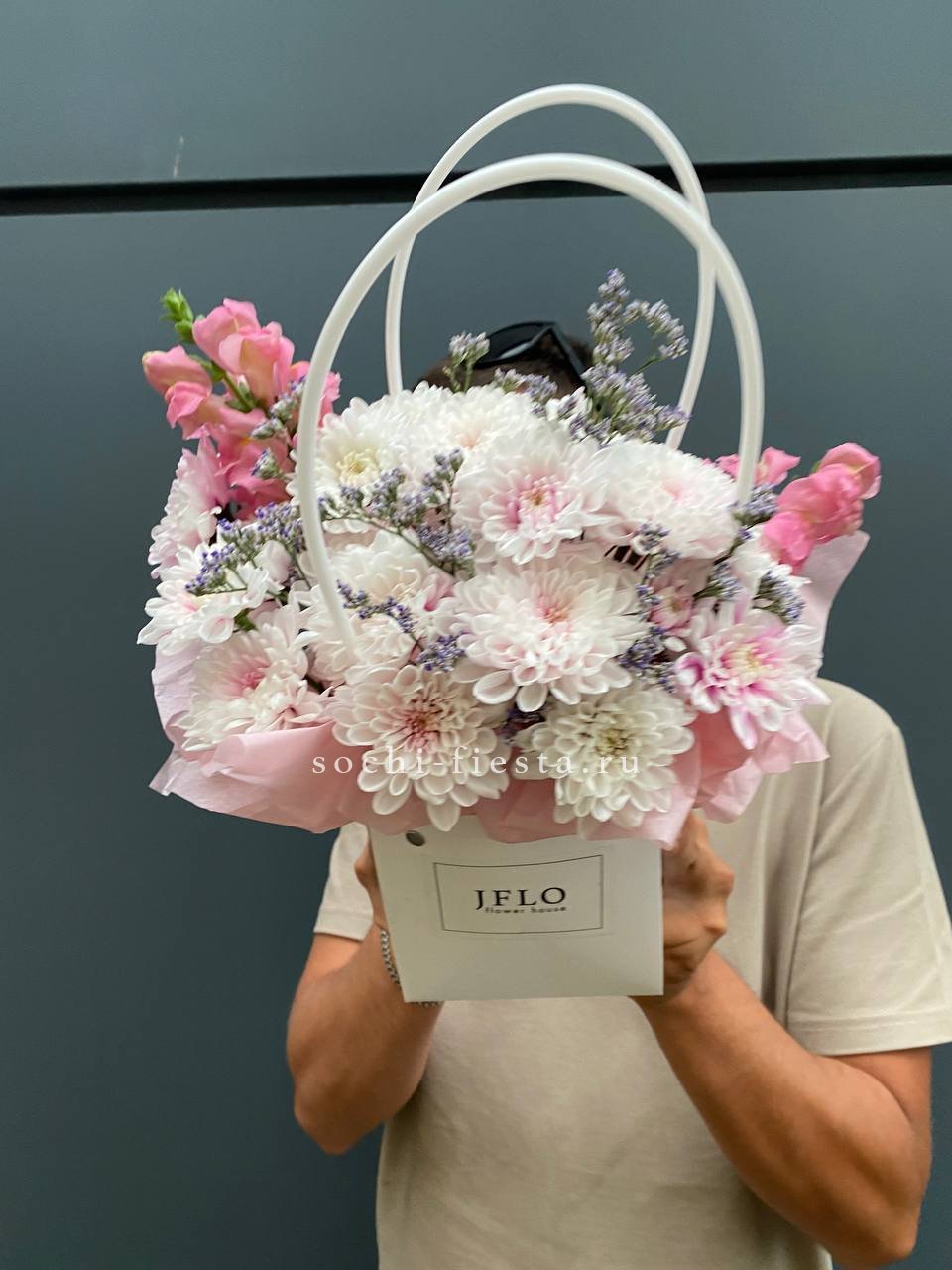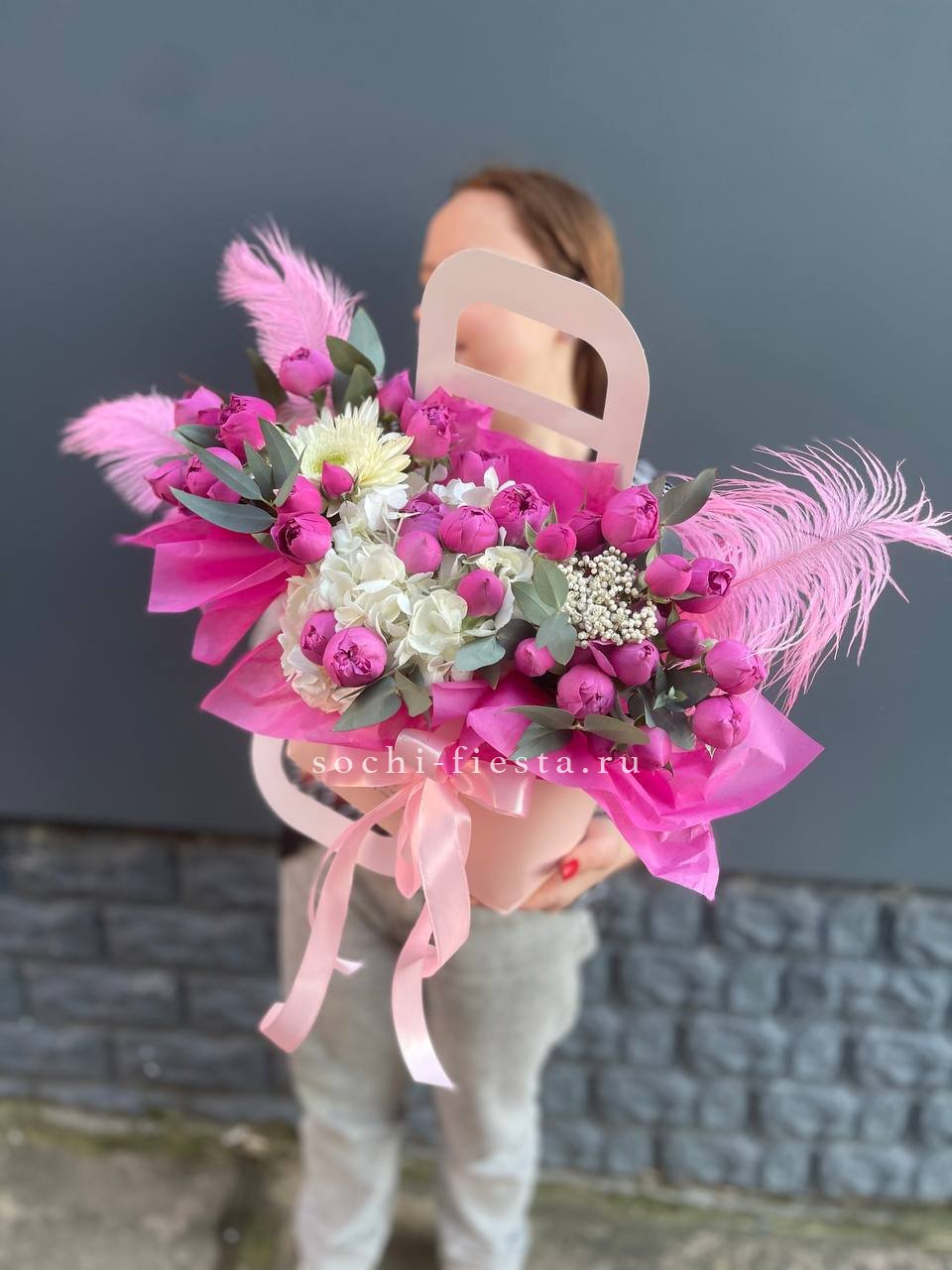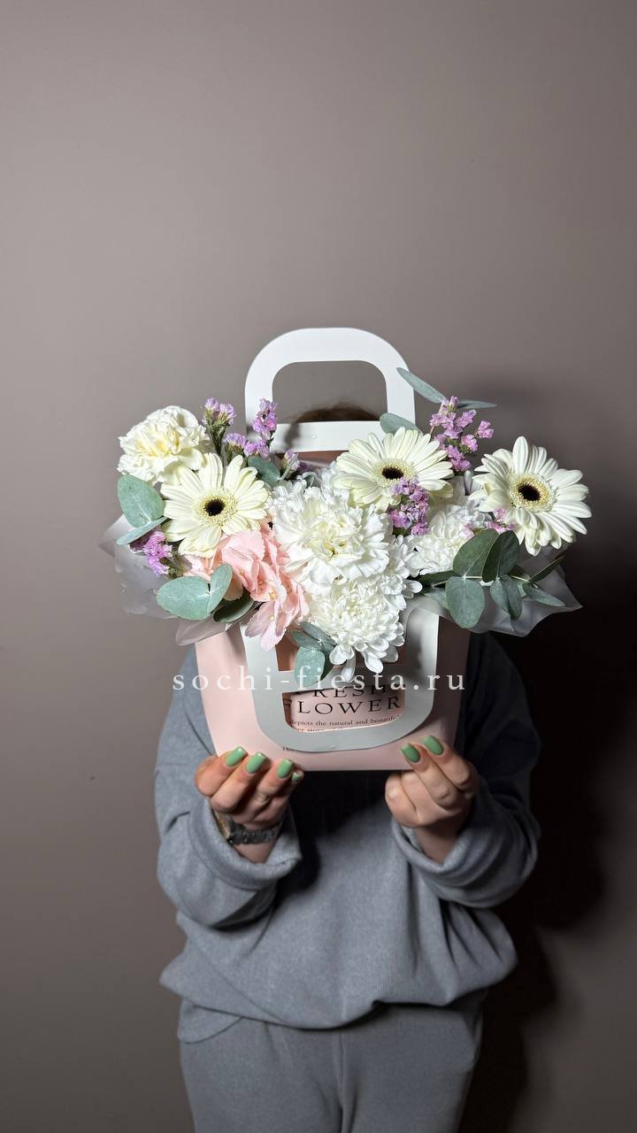 Голубая гортензия задает тон всей композиции, а яркие герберы и диантусы добавляют живости. Компактная форма в сумочке удобна для вручения и не требует вазы.