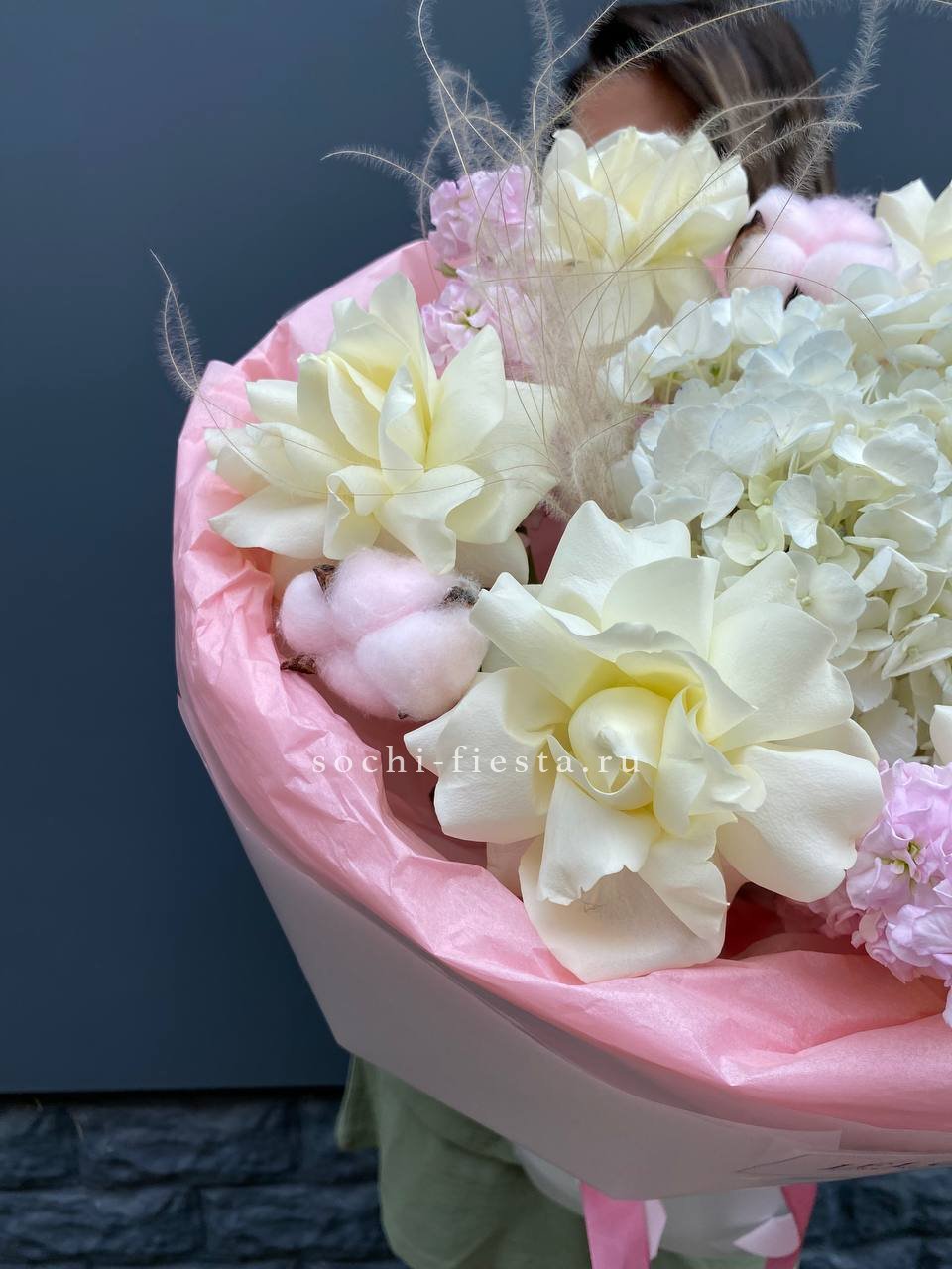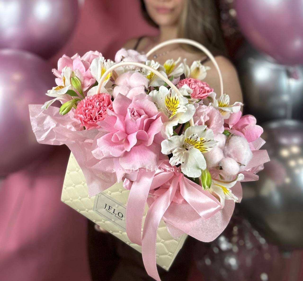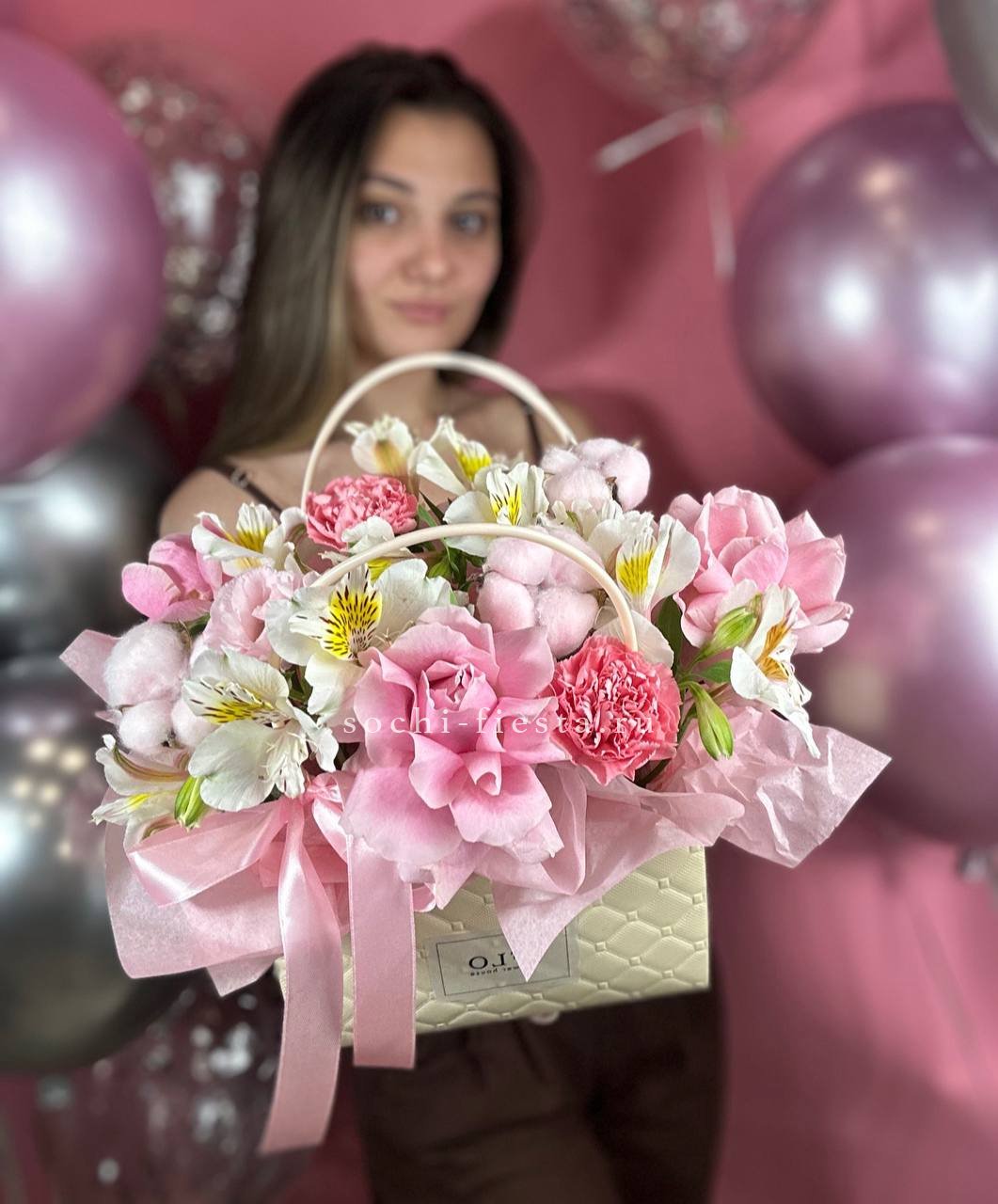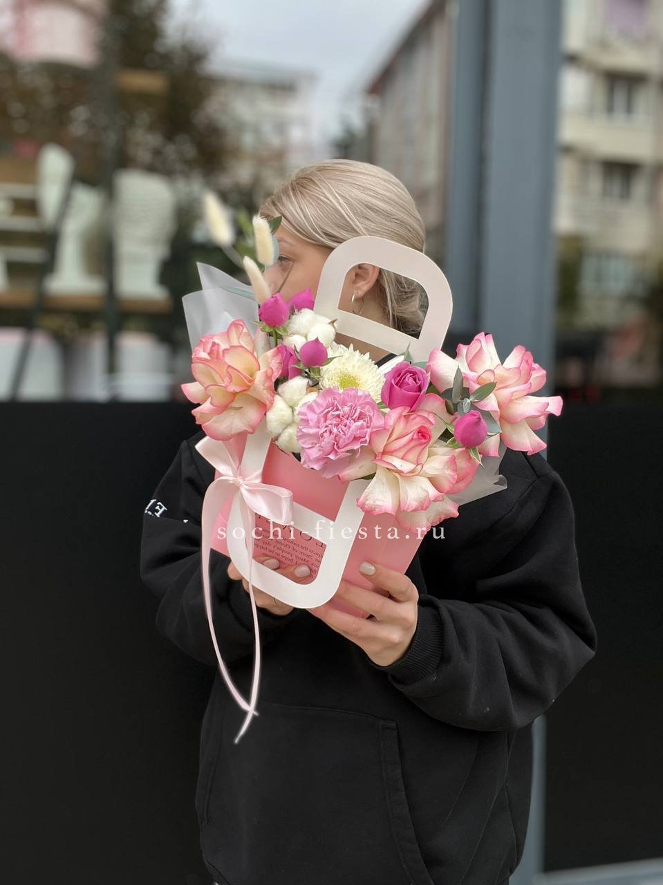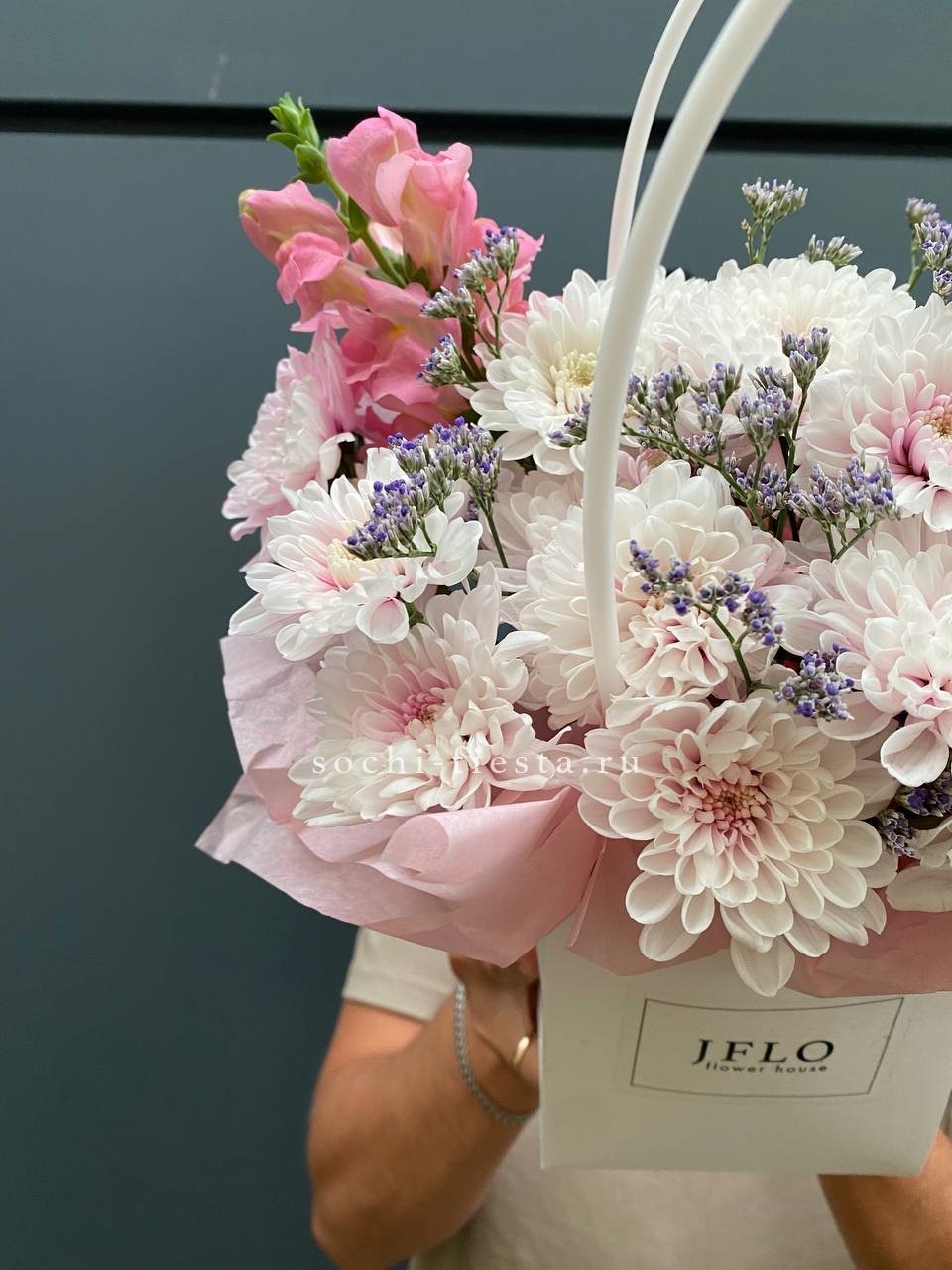 Голубая гортензия задает тон всей композиции, а яркие герберы и диантусы добавляют живости. Компактная форма в сумочке удобна для вручения и не требует вазы.