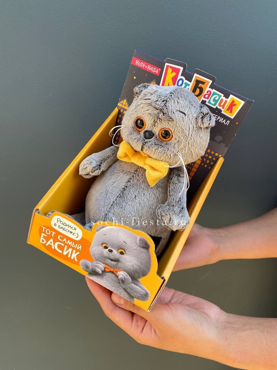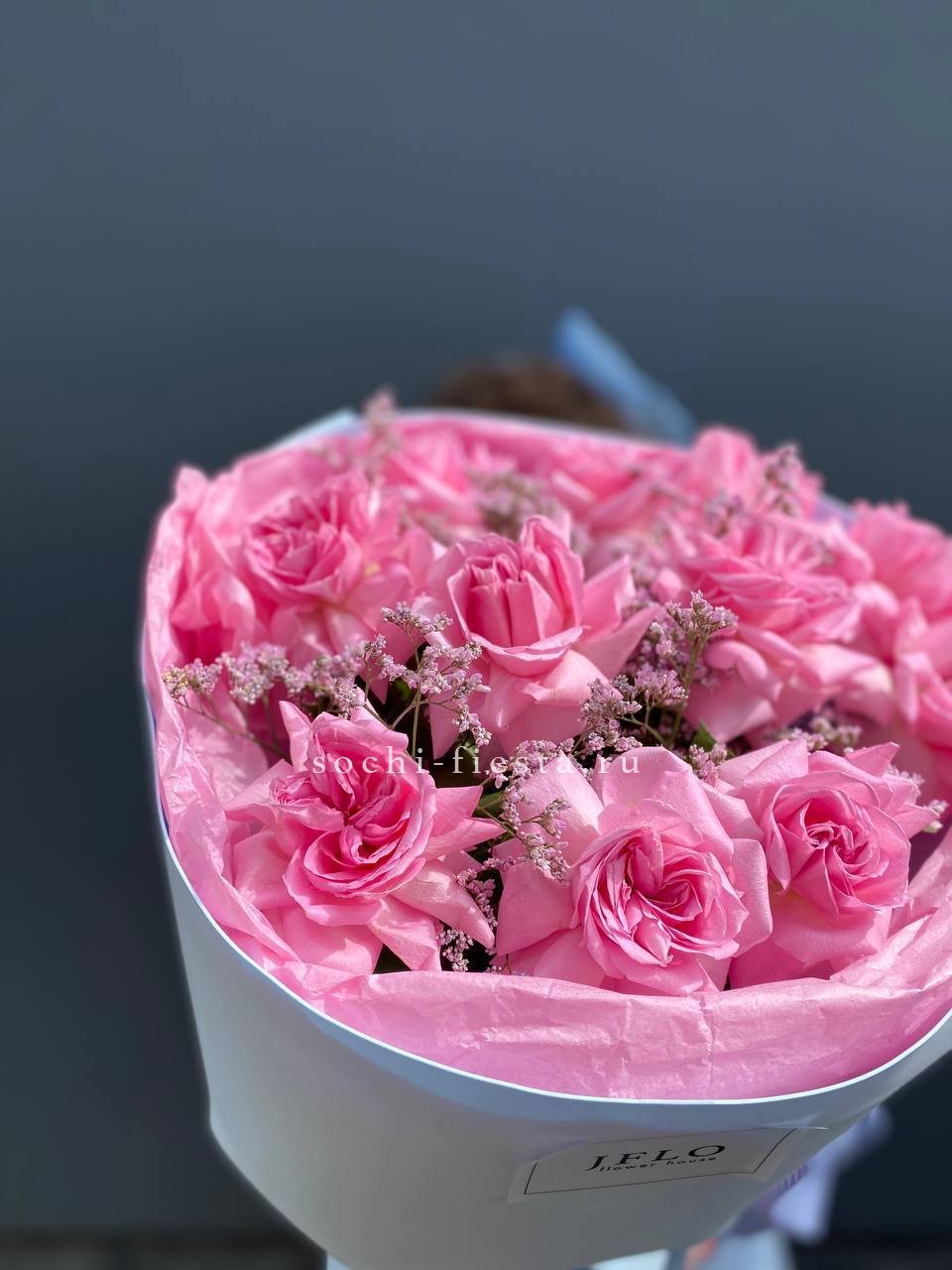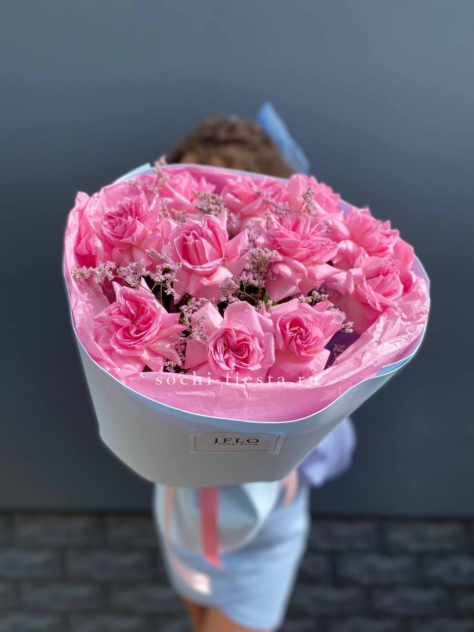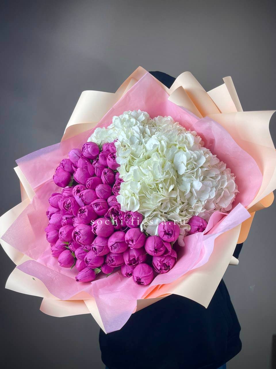 Голубая гортензия задает тон всей композиции, а яркие герберы и диантусы добавляют живости. Компактная форма в сумочке удобна для вручения и не требует вазы.