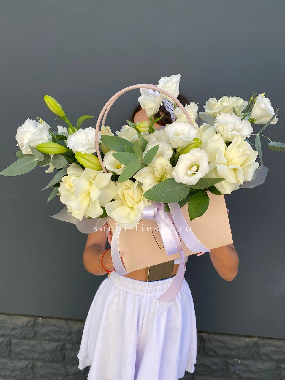 Mattina собрана из эустомы, французских роз и лилии с добавлением эвкалипта. Композиция держит форму и создаёт ощущение утренней свежести в компактном формате.