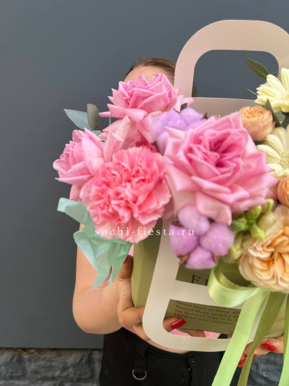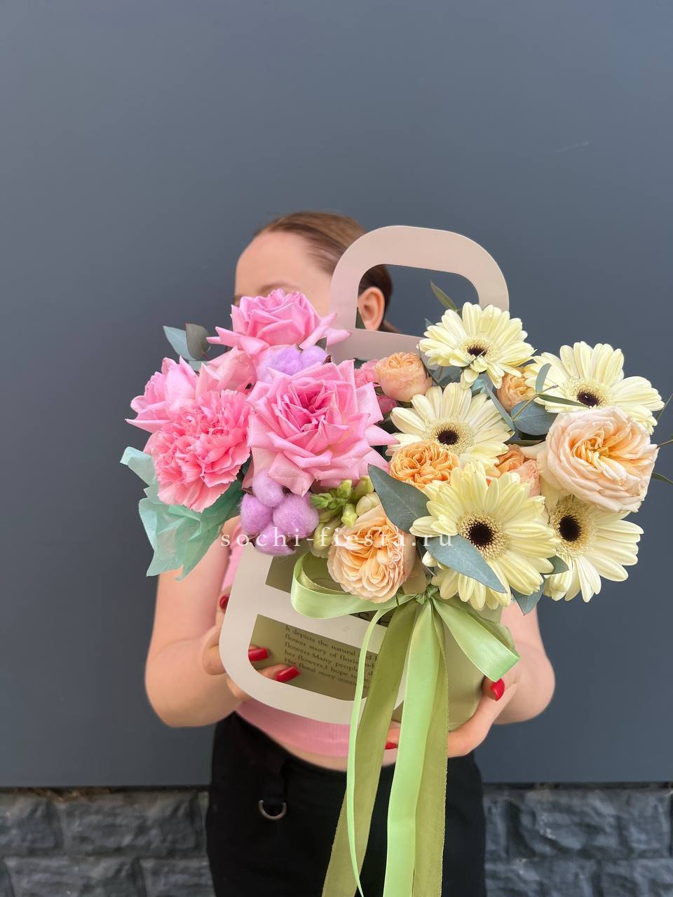 Компактная сумочка в двух оттенках объединяет цветы с мягкими переходами тонов. Форма держится плотно и естественно. Подходит для поздравлений и встреч без лишних деталей.