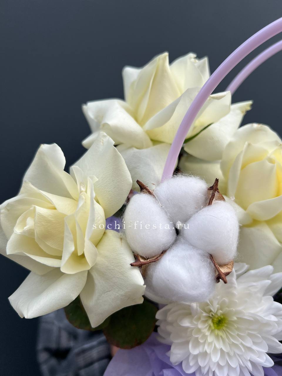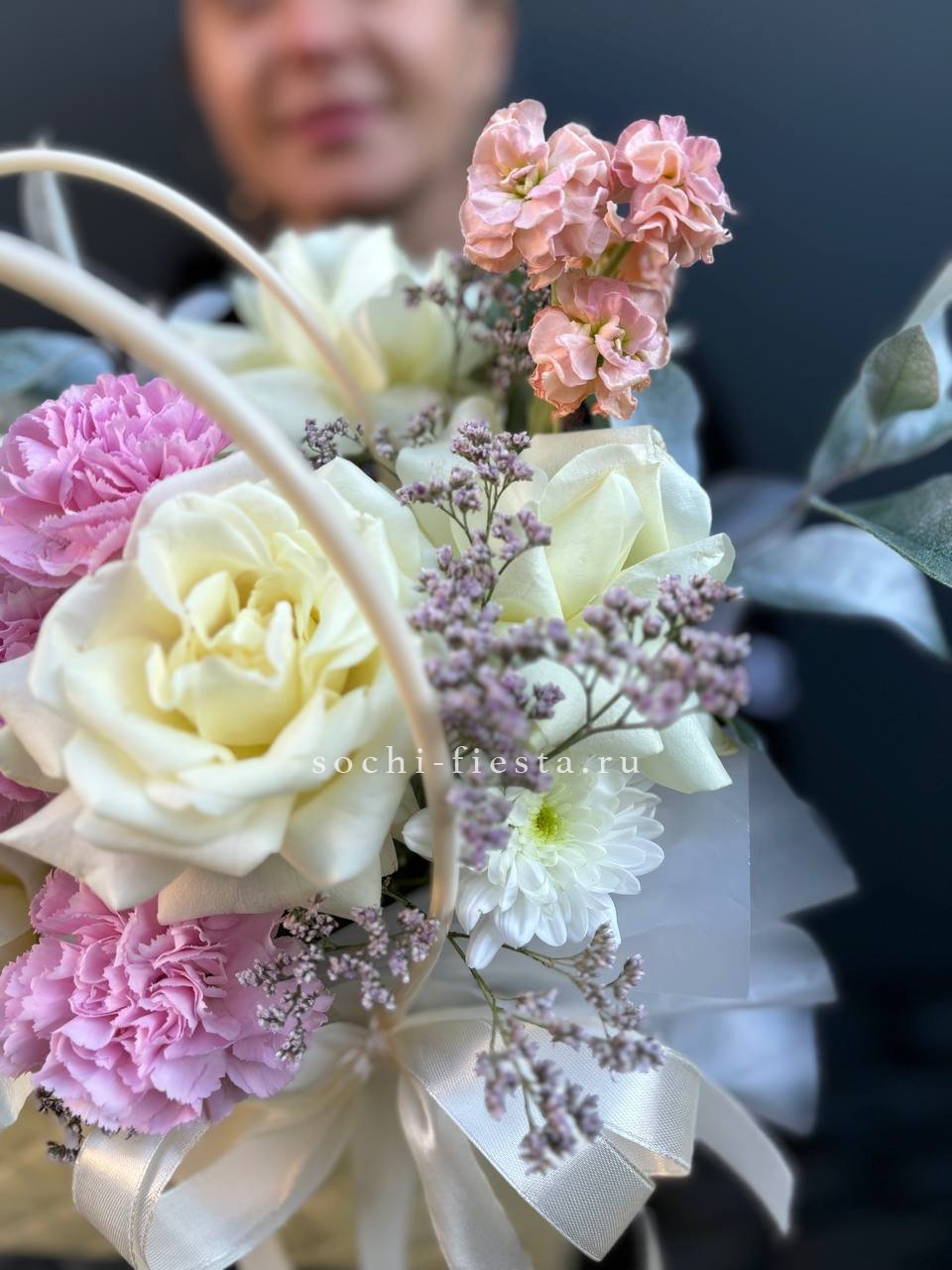 Розовые розы и диантусы переплетаются с кустовыми хризантемами в плотной округлой композиции. Альстромерия добавляет графичные акценты между бутонами. Сумочка собирает все элементы в аккуратную форму с естественным объёмом.