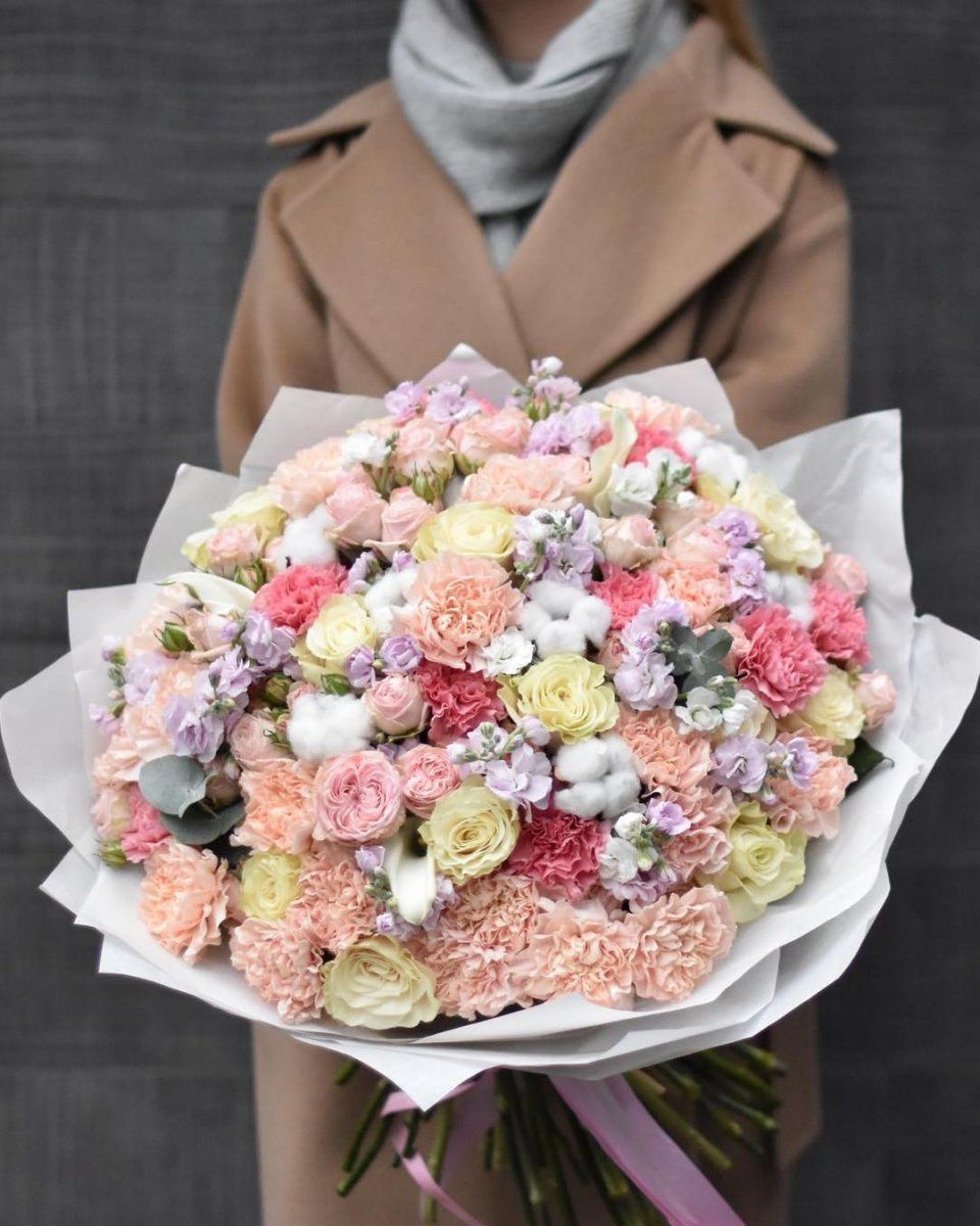 Первый взгляд цепляется за игру фактур: плотные головки гербер соседствуют с воздушными соцветиями мисти баблс и гортензии. Озотамнус добавляет графичные точки между крупными бутонами.