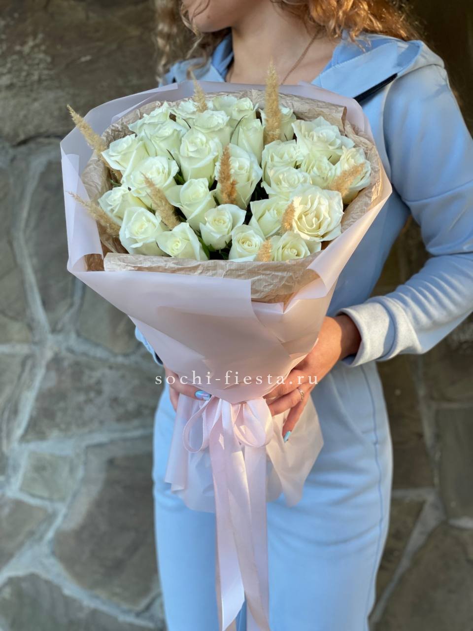 25 белых роз с сухоцветами