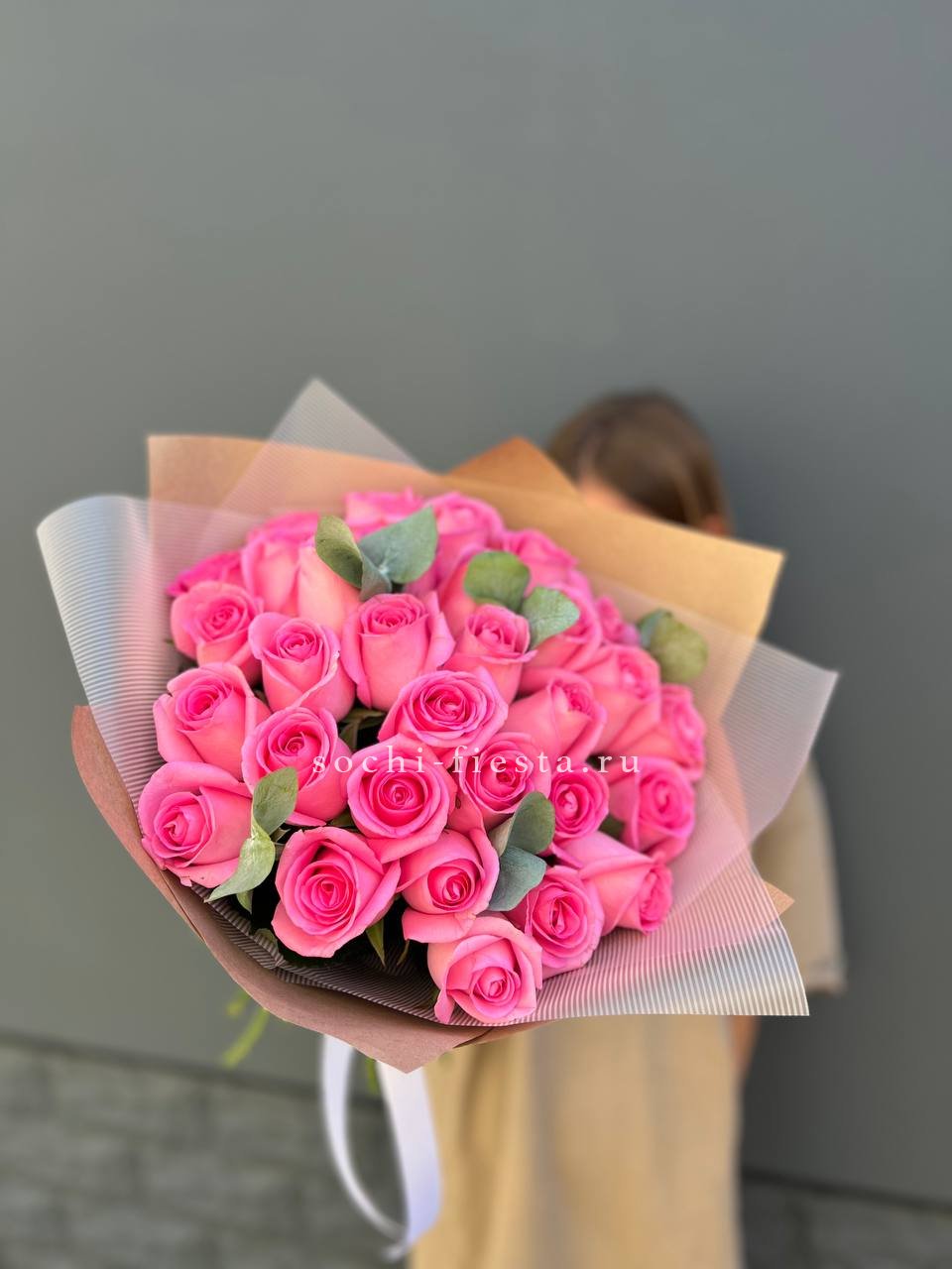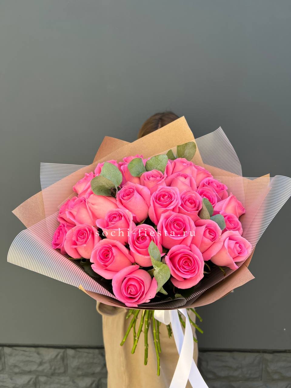 31 розовая роза с эвкалиптом