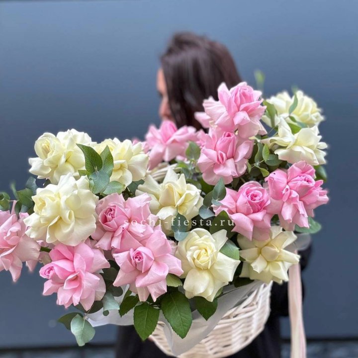 Именинная корзина в Невинномысске — самый популярный частный формат. Флорист создаёт куполообразную аранжировку в плетёной корзине диаметром 35-55 см. Розы или пионы в основе, зелень и декоративные акценты — нарядный объект, который сразу создаёт торжественную атмосферу. Именно такую корзину несут на юбилей или важный день рождения, когда хотят, чтобы подарок был виден и запомнился.
