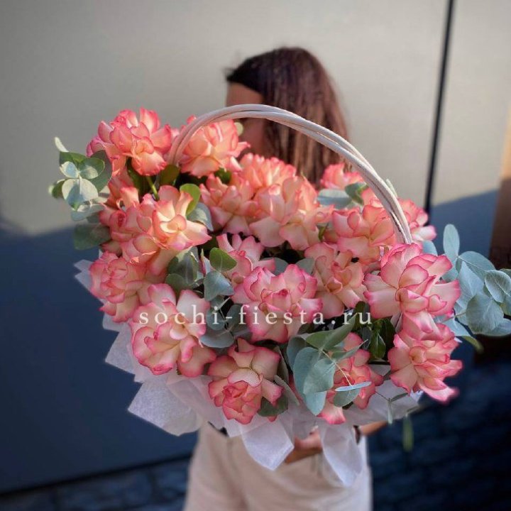 Состав корзин в Невинномысске определяется текущими поставками и сезоном. Розы Freedom, Mondial, Cappuccino — для классических куполообразных аранжировок. Пионы в мае-июне из свежих поставок: Sarah Bernhardt, Red Charm, Bowl of Cream — главный сезонный продукт. Хризантема, альстромерия, гербера — для объёмных торжественных наполнений. Эустома, ранункули — для садовых корзин. Флорист строит состав под конкретный запрос.