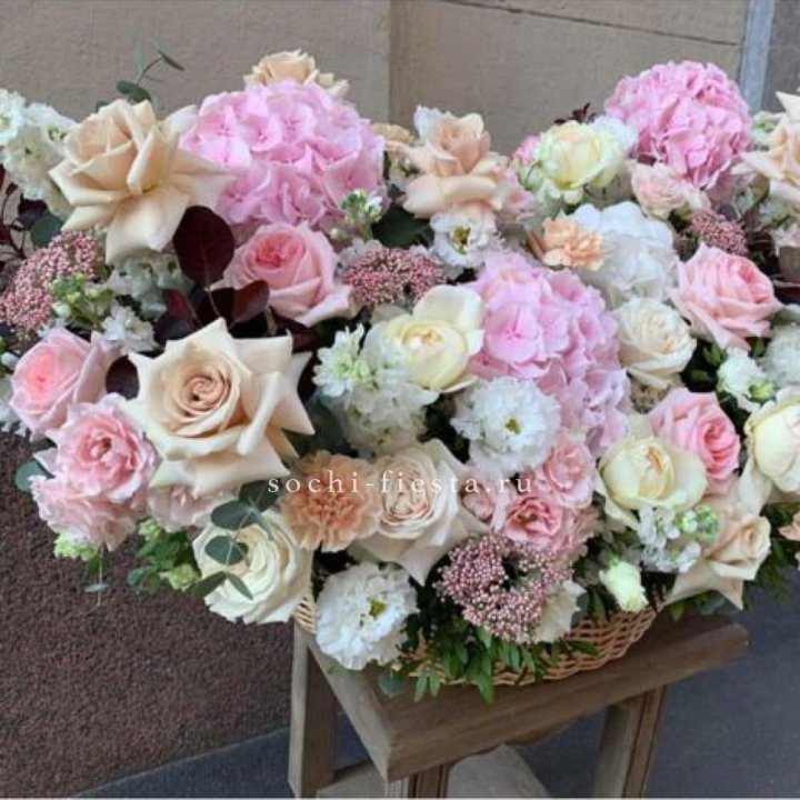 Состав корзин в Невинномысске строится из лучшего, что есть в текущей поставке. Розы — Freedom, Mondial, Cappuccino — для торжественных куполообразных аранжировок. Пионы в мае-июне: Sarah Bernhardt, Red Charm — главный сезонный продукт. Хризантема кустовая и альстромерия — для объёмных наполнений. Эустома и ранункули — для садового стиля. Флорист создаёт состав под бюджет и повод.