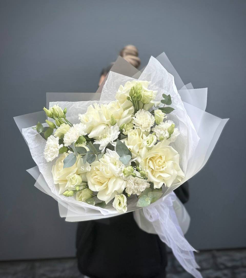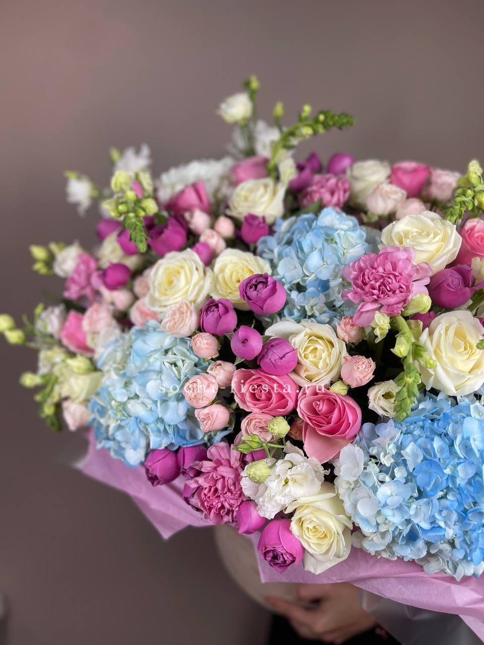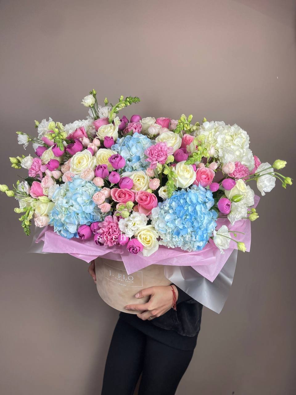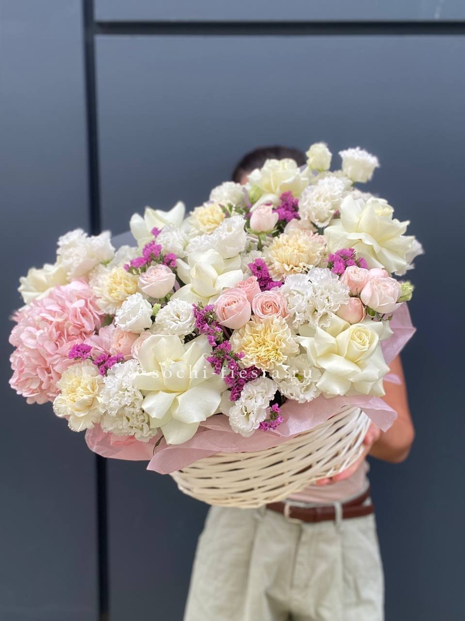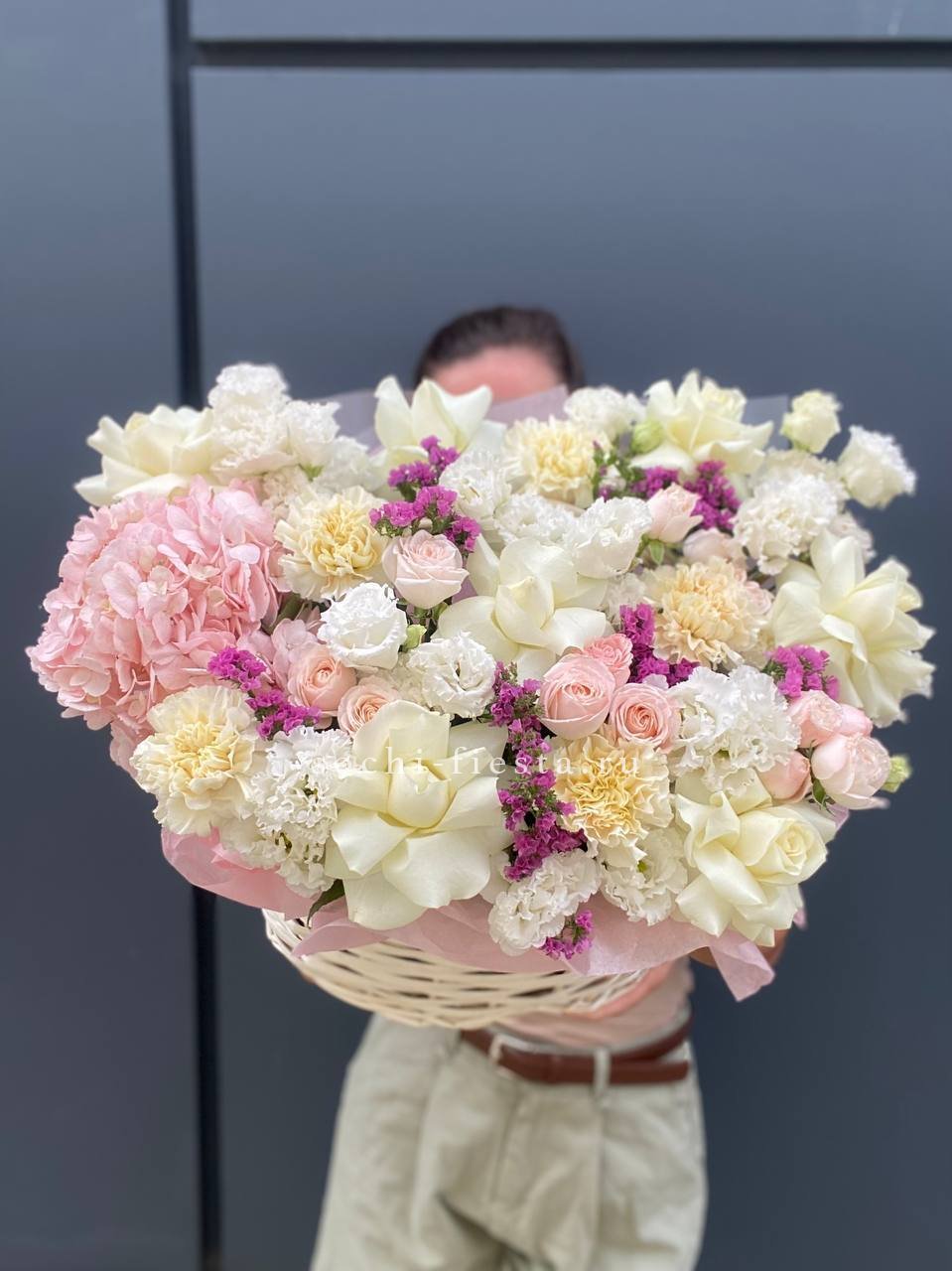 Корзина объединяет гортензии, эустомы, розы и маттиолу в многослойную композицию. Разные фактуры лепестков создают визуальную глубину и насыщенность.