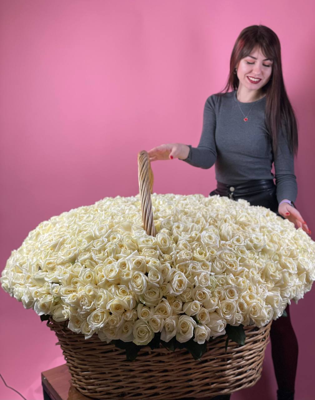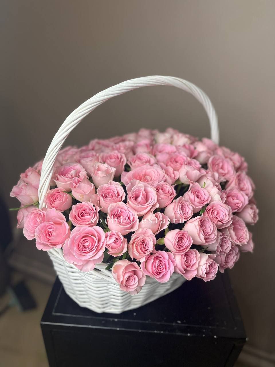 гортензия, эустома, розы, маттиола (дельфиниум или аналоги), кустовые розы, лента, корзина D40.