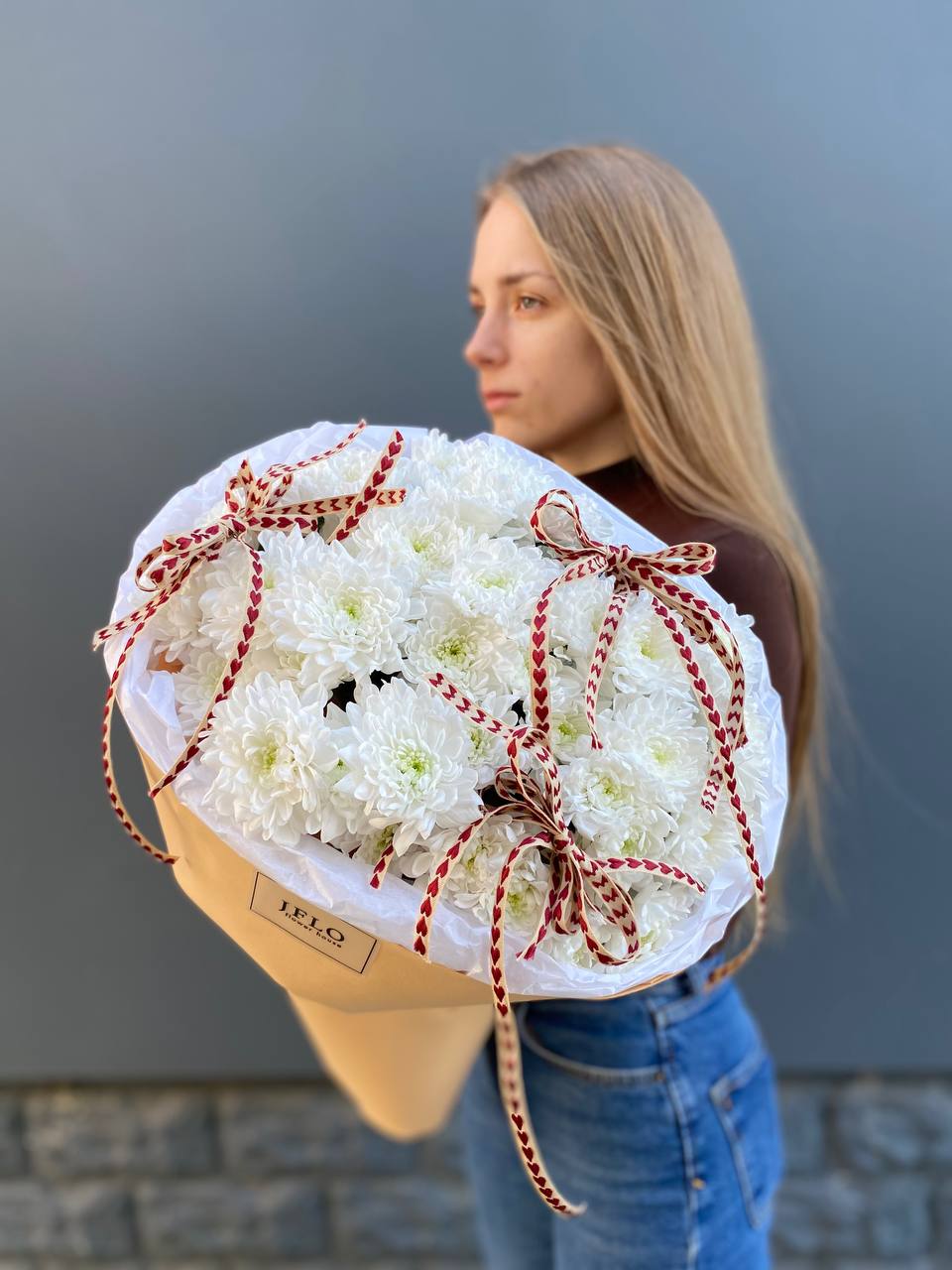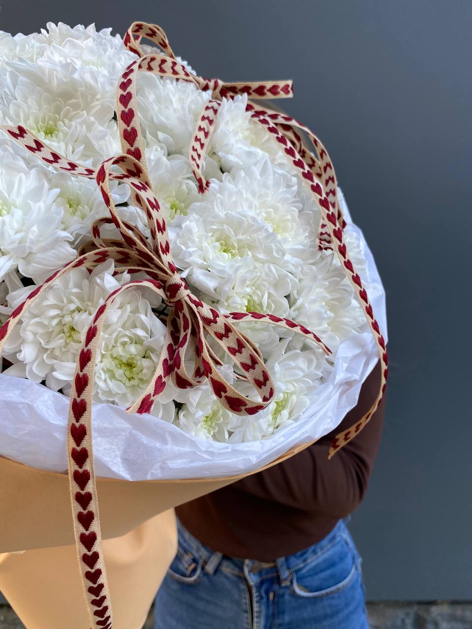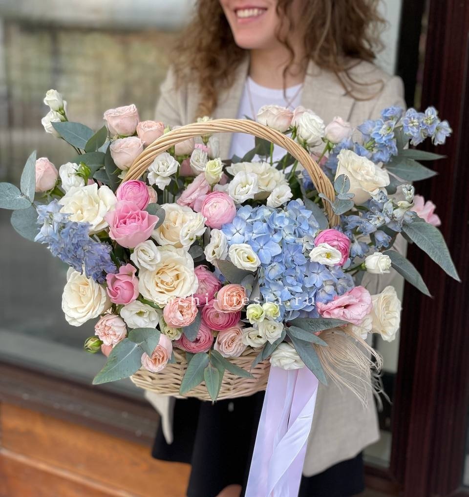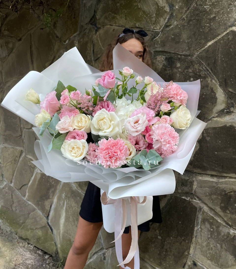 Здесь идеально сочетаются крупные, бархатистые бутоны роз, облака гортензии и мелкие акцентные цветы. Получилась невероятно воздушная и легкая композиция, которая мгновенно создает ощущение праздника и весеннего настроения. Стильный бант завершает этот изысканный образ.