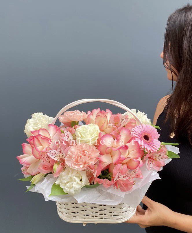 розы нежных оттенков (по возможности джумилия),эустома, диантусы, гербера, альстромерии, лента, корзина