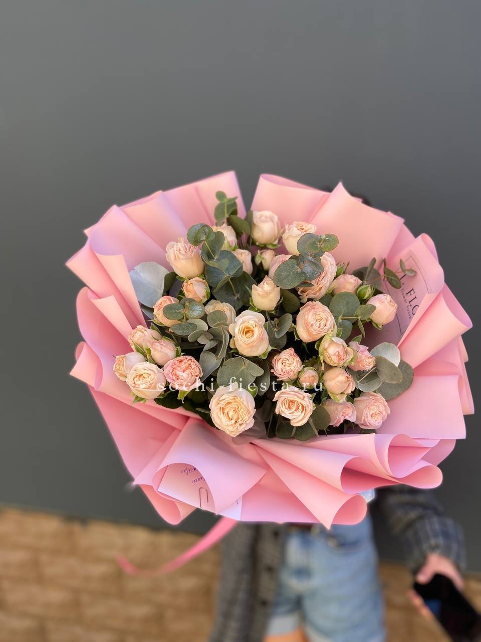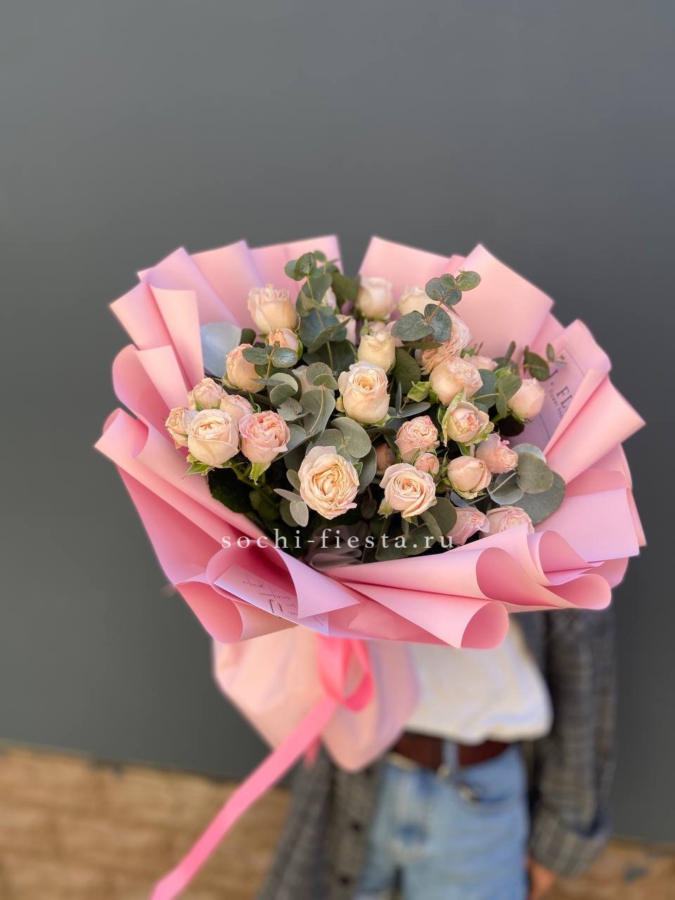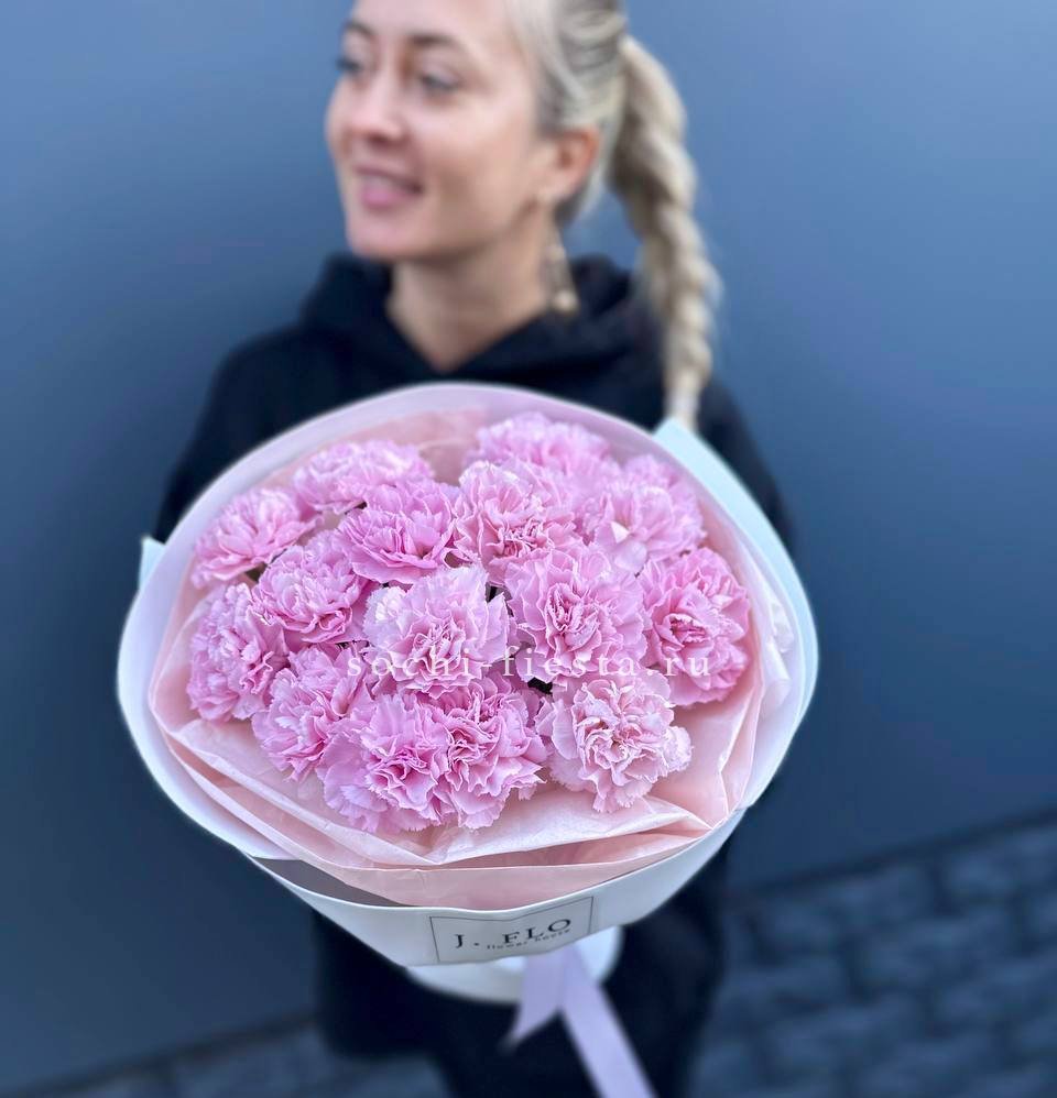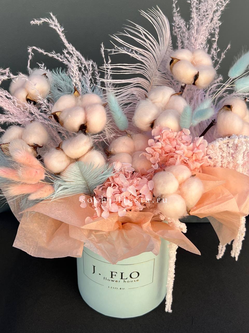 Пятьдесят один бутон Мисти Баблс собраны в плетёную корзину и образуют плотную цветущую полусферу. Лавандовые оттенки раскрываются постепенно и держат форму долго.