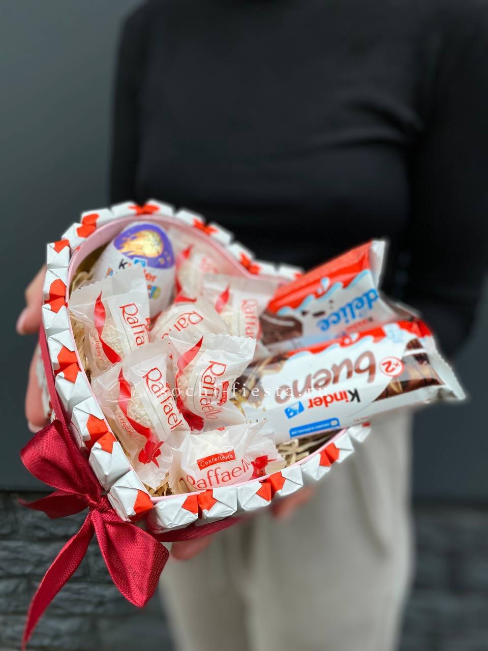 Коробка в форме сердца собрала внутри Рафаэлло, шоколадные батончики Bueno, хрустящий Delice и классический Киндер. Всё уложено так, чтобы сразу захотелось открыть и попробовать. Готовое решение для сладкого сюрприза.