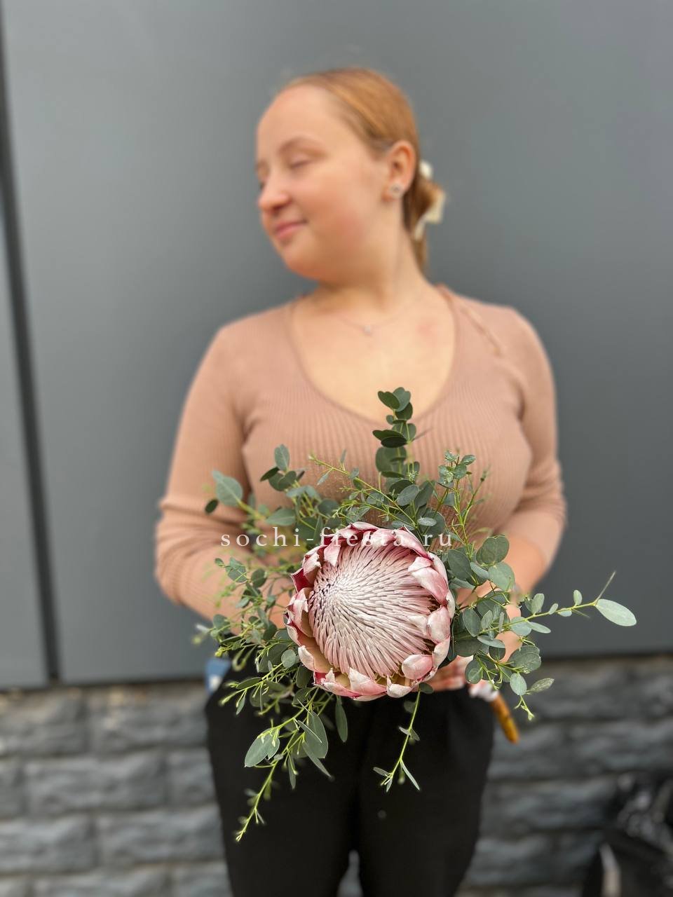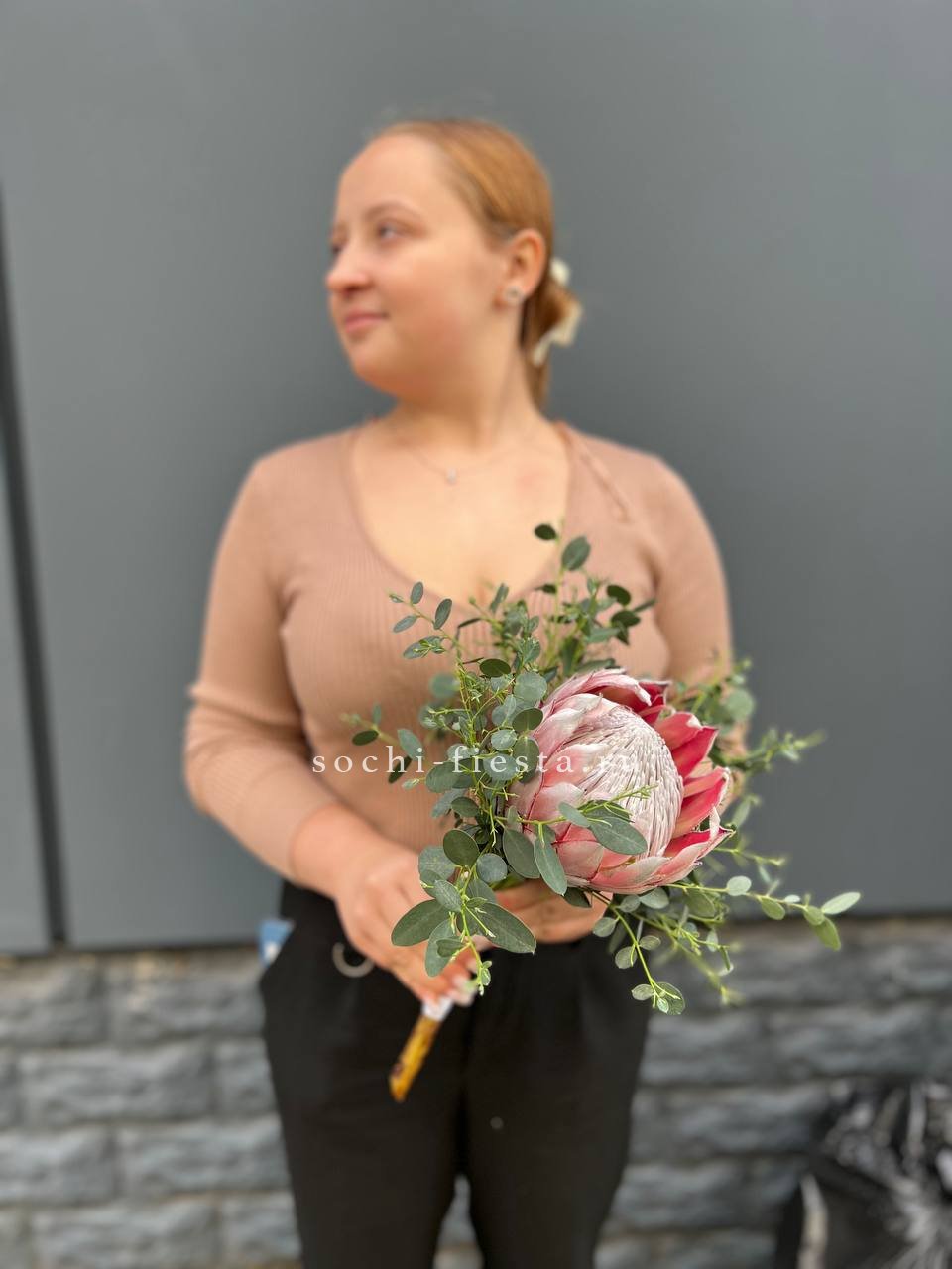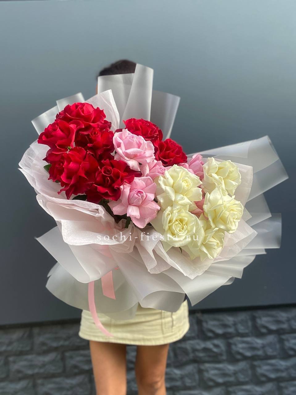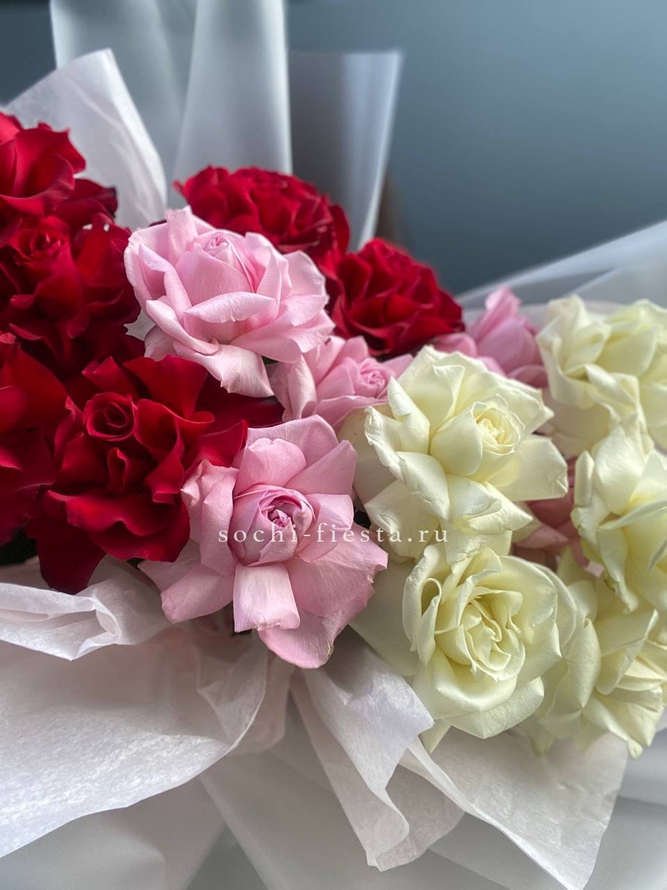 Переход от белого к розовому создаёт мягкую игру тонов. Эвкалипт добавляет фактурности и свежести зелени. Одиннадцать роз складываются в гармоничную композицию с лёгким характером.