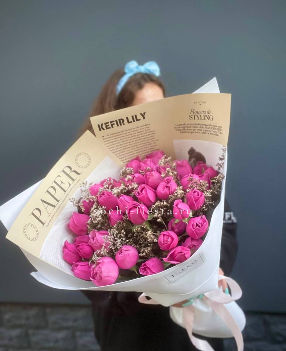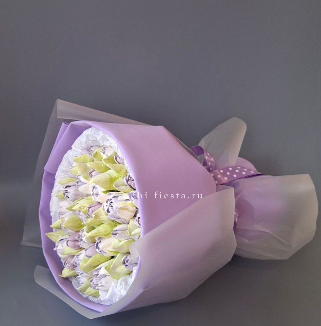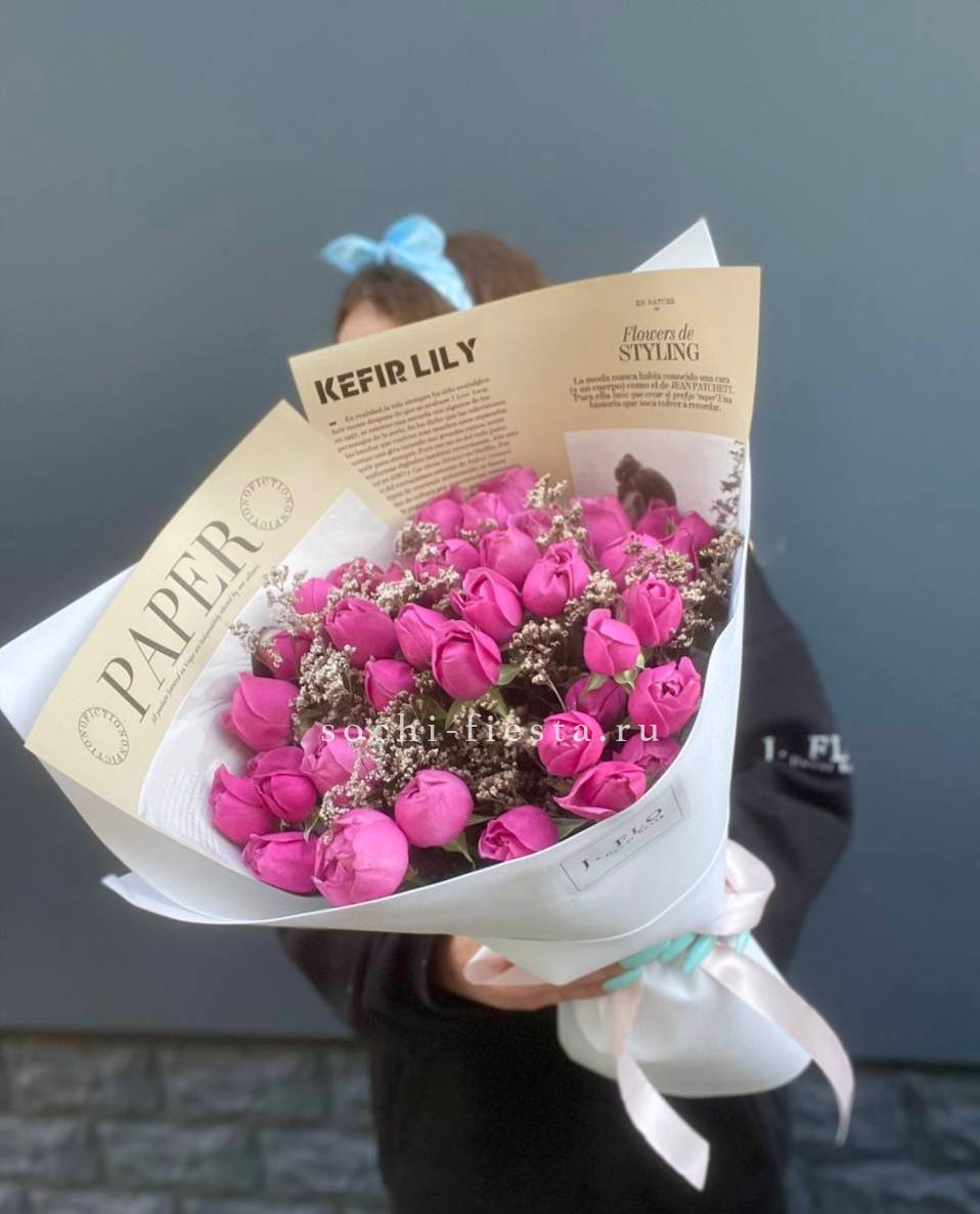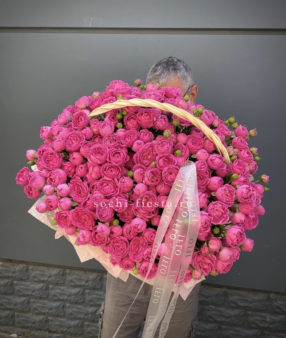 Переход от белого к розовому создаёт мягкую игру тонов. Эвкалипт добавляет фактурности и свежести зелени. Одиннадцать роз складываются в гармоничную композицию с лёгким характером.