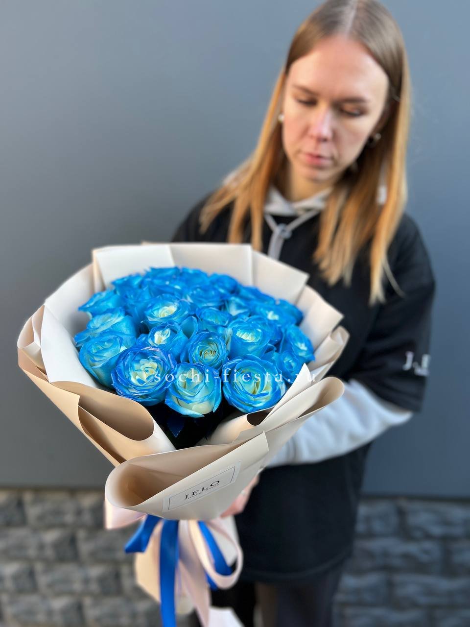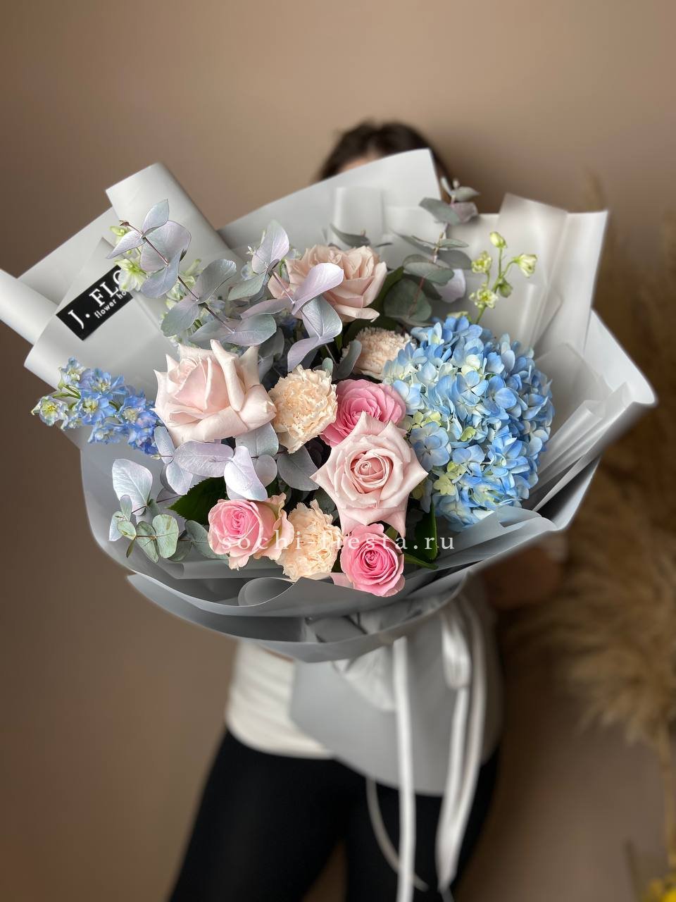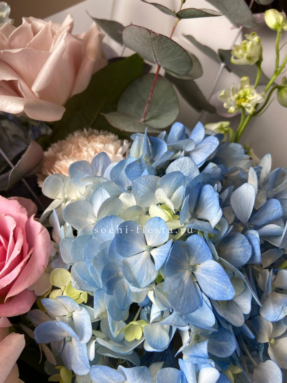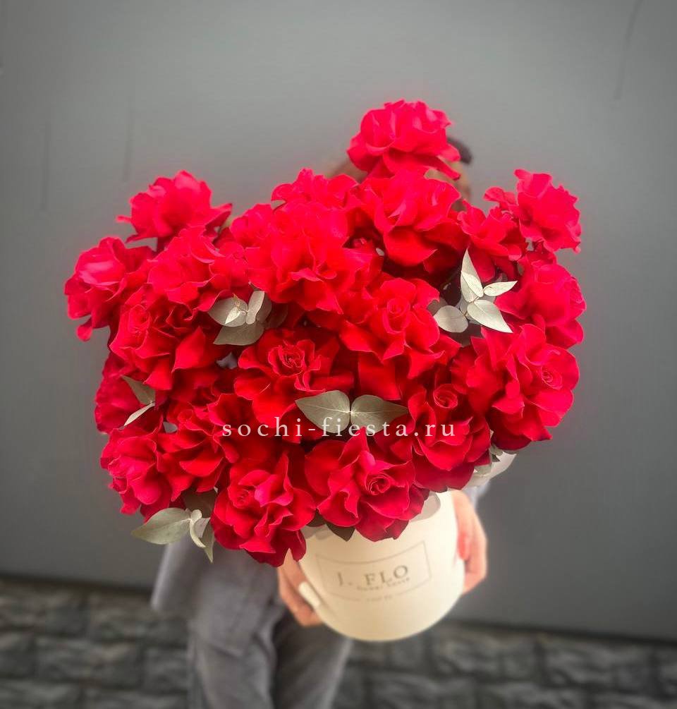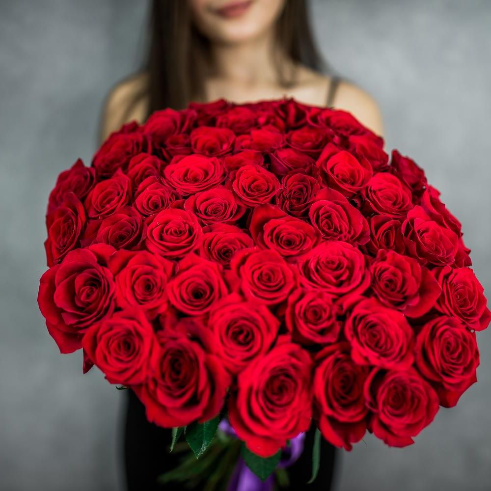 Сто один красный бутон дополнен ветками эвкалипта с серебристой листвой. Объёмная композиция занимает пространство и притягивает внимание своей масштабностью.