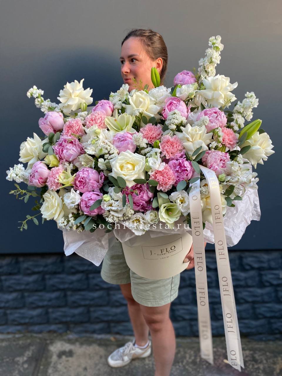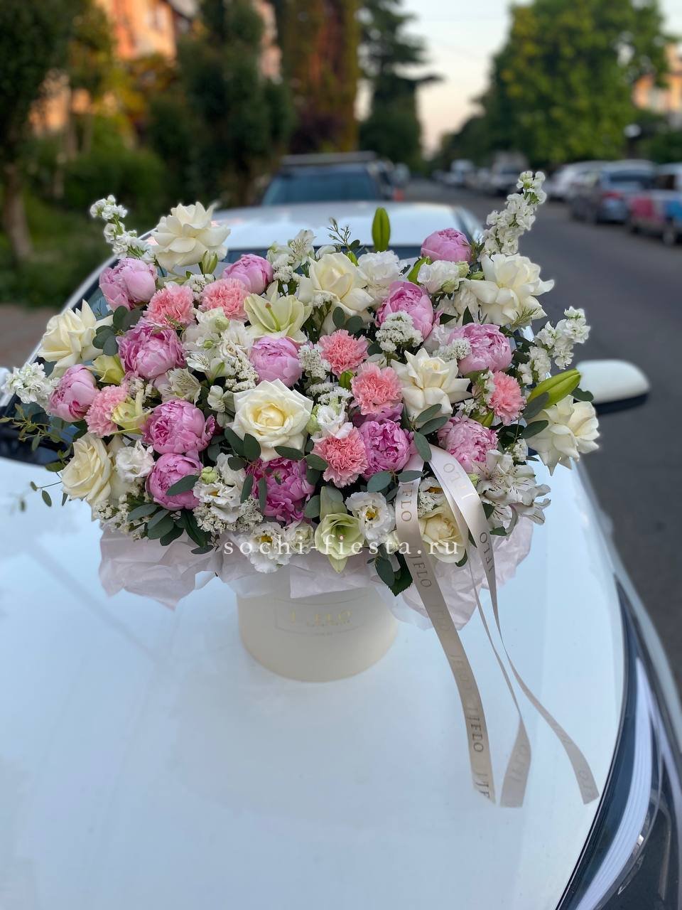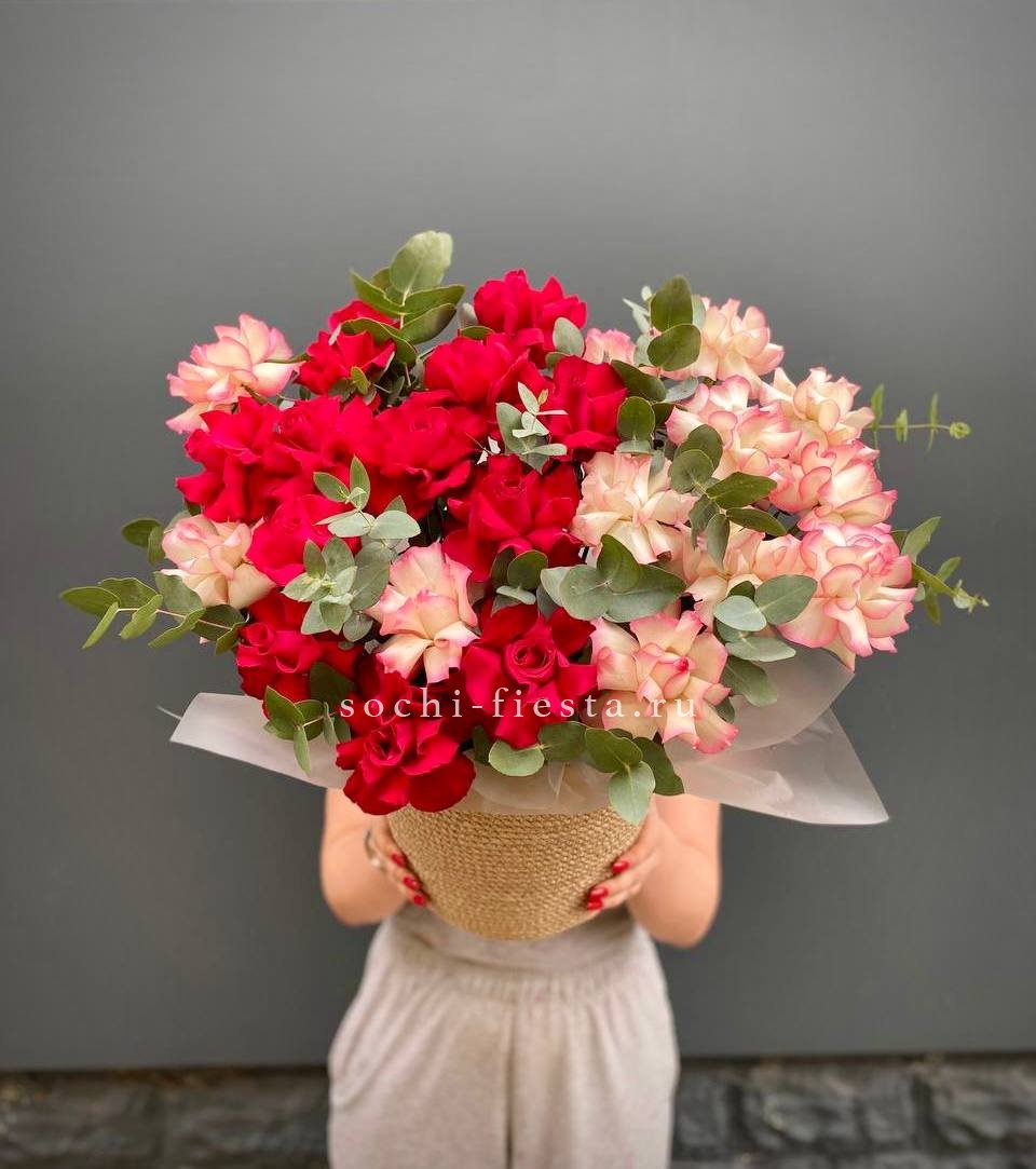 Красные розы образуют rounded форму с равномерным распределением бутонов. Фоамиран добавляет мягкую текстуру по краю, создавая завершенную композицию для яркого жеста.