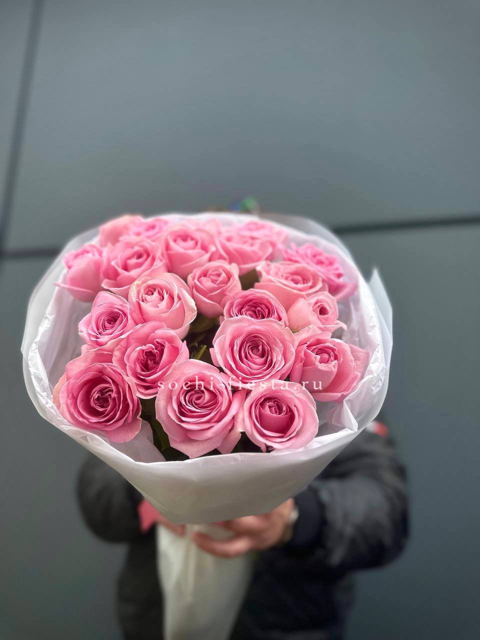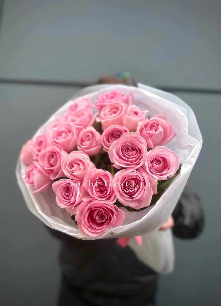 Сто одна роза в мягком розовом оттенке образует плотный объёмный букет. Бутоны раскрыты равномерно и создают впечатление цветочного облака в руках.