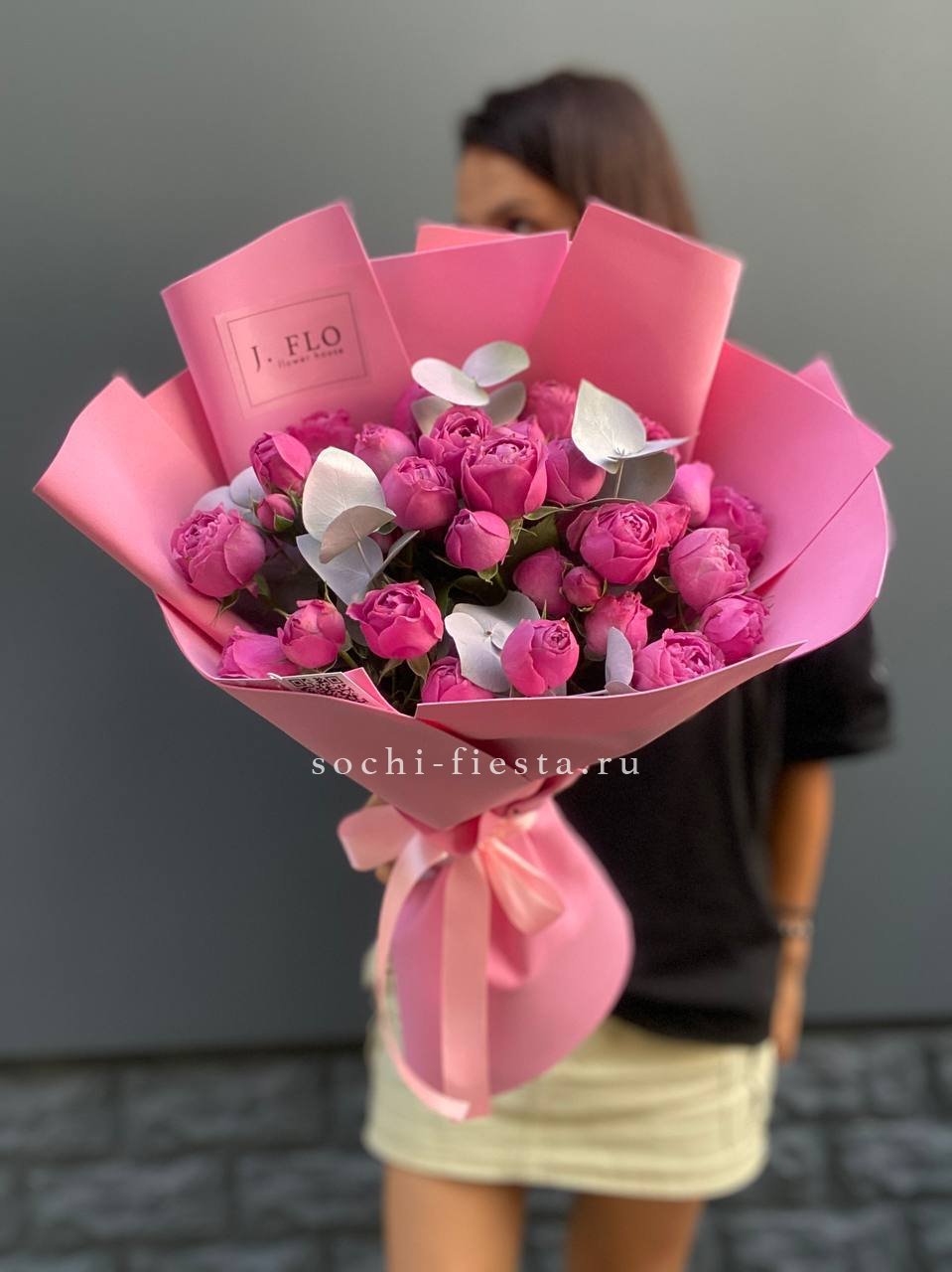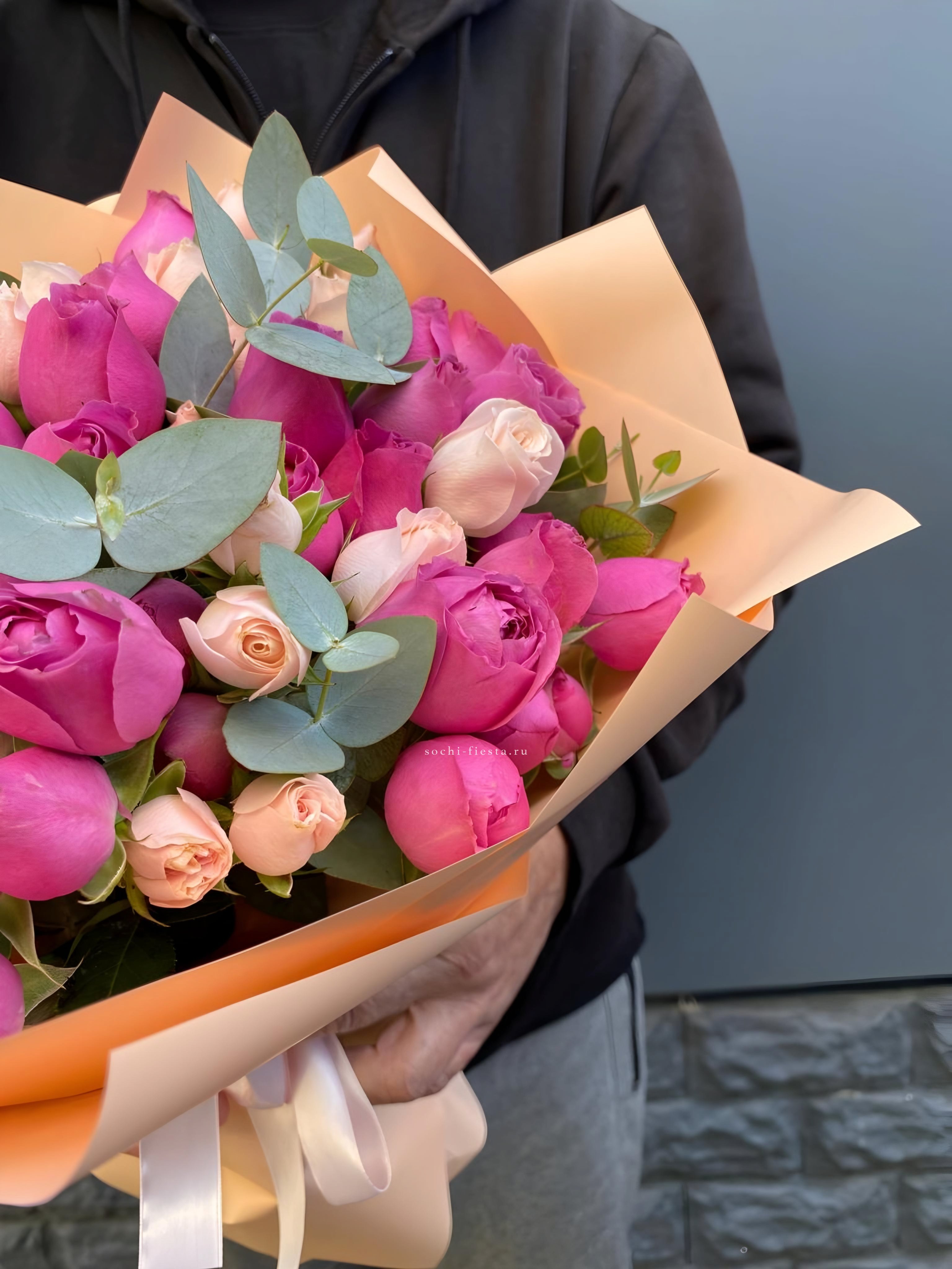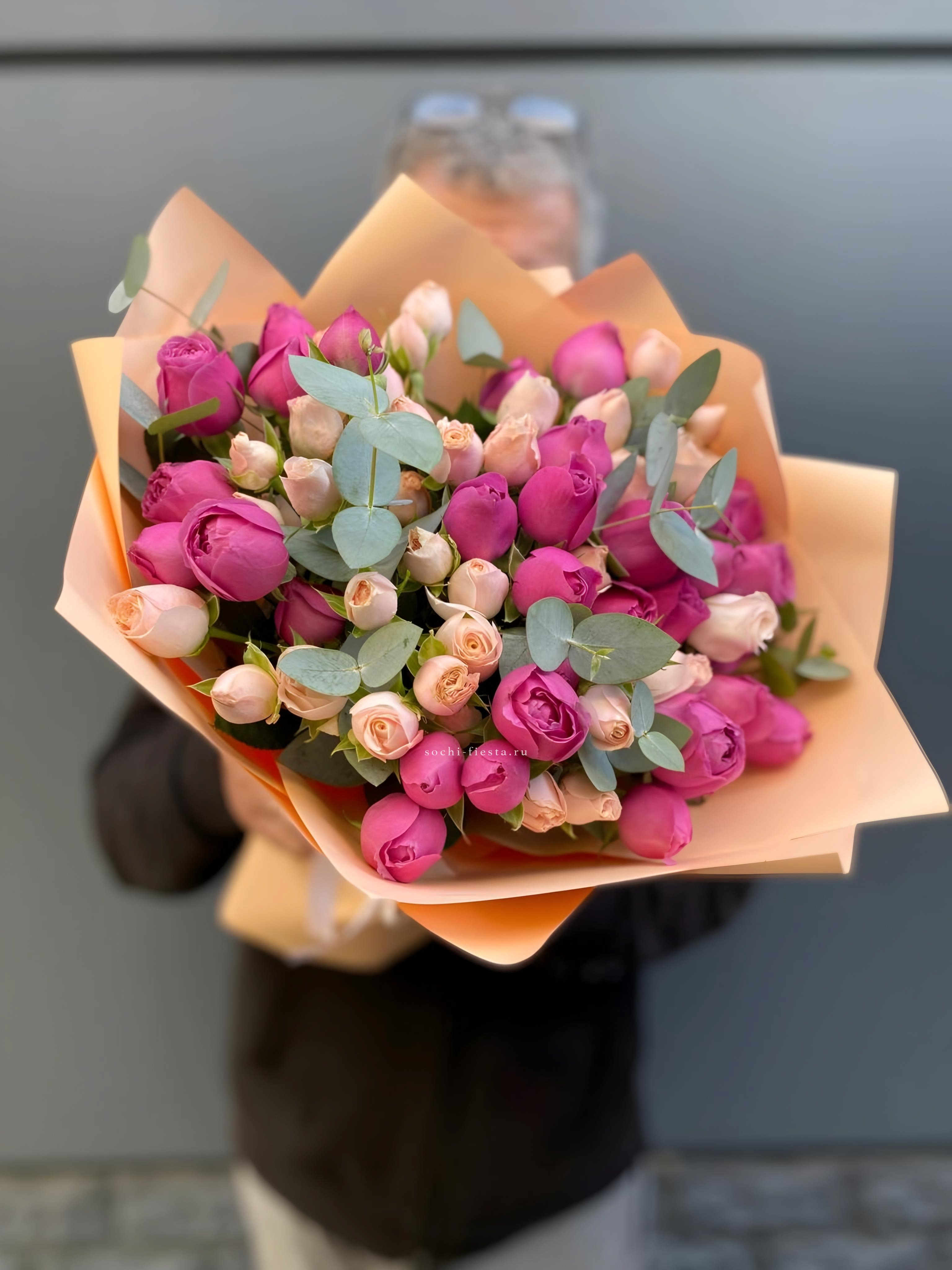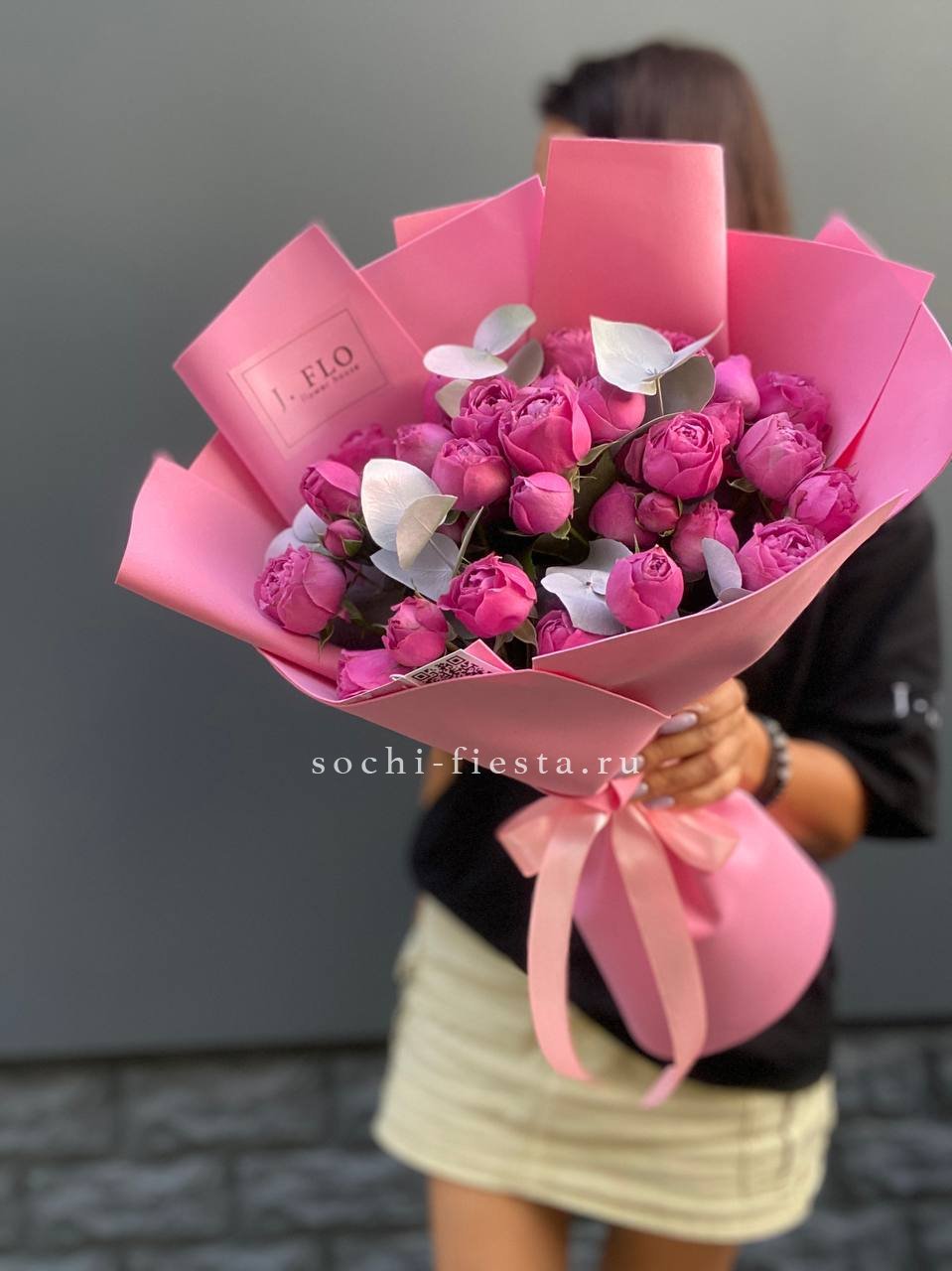 Девять бутонов собраны в компактную форму и обернуты крафтом. Розовый оттенок мягкий и натуральный. Букет занимает мало места и долго сохраняет свежесть.