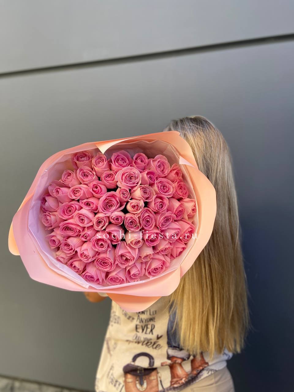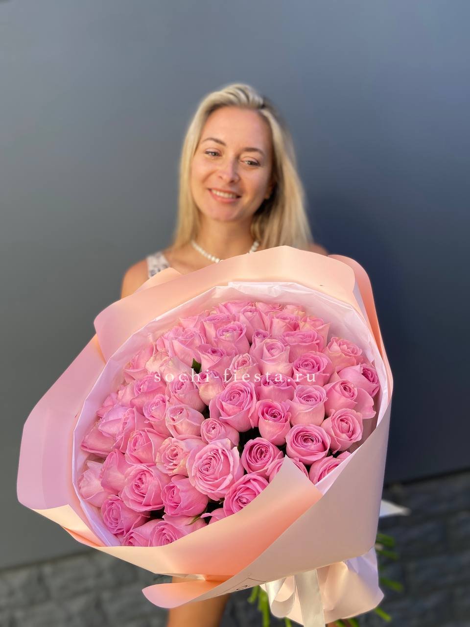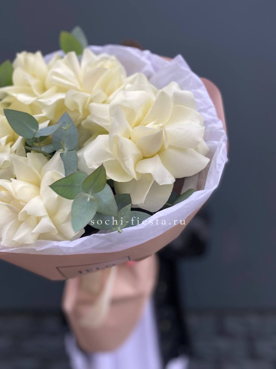 Пять французских роз с вывернутыми лепестками раскрываются широко и создают эффект лёгкой небрежности. Эвкалипт поддерживает форму и добавляет свежести белому цвету.