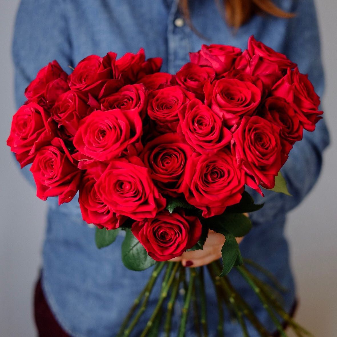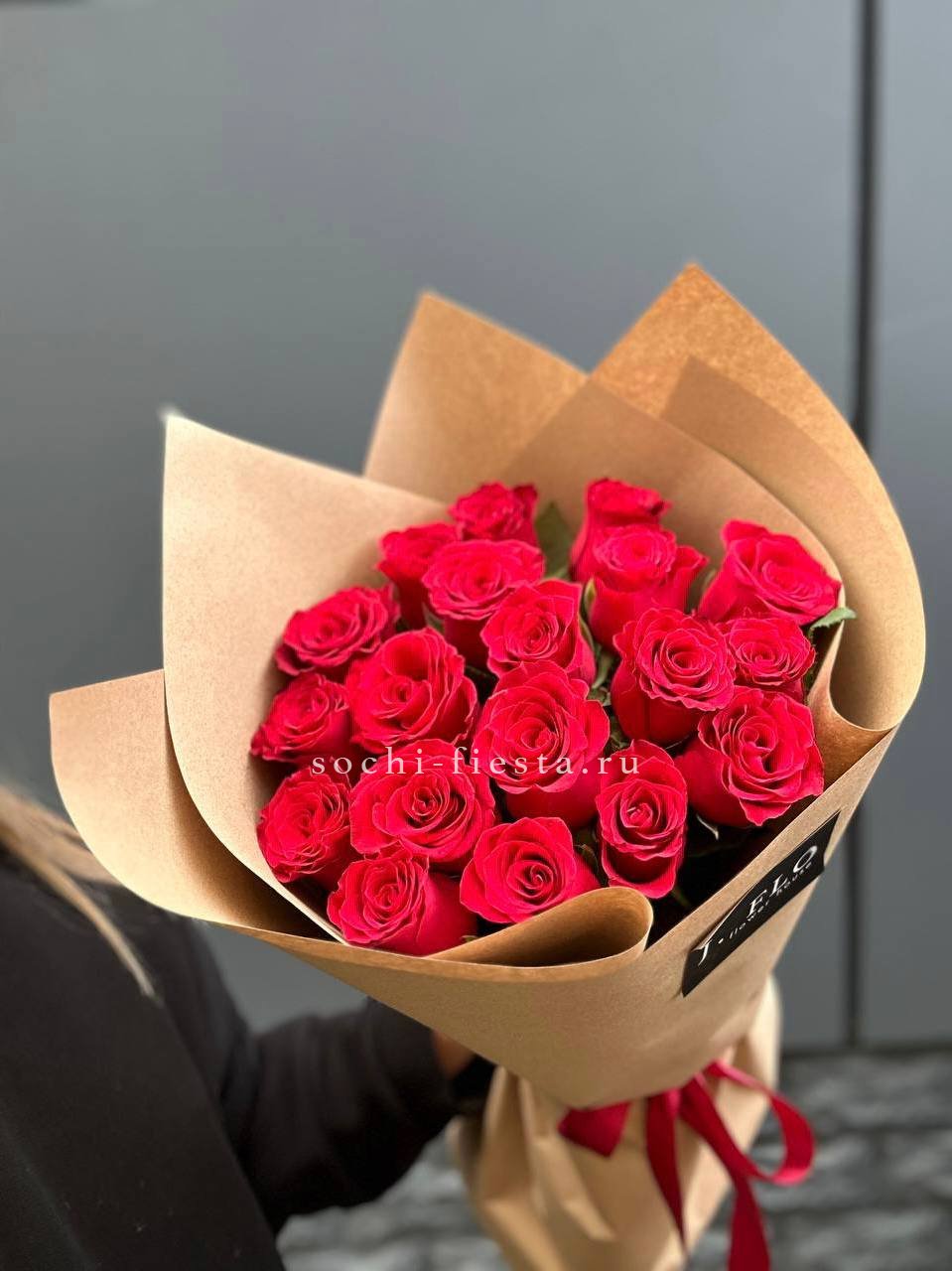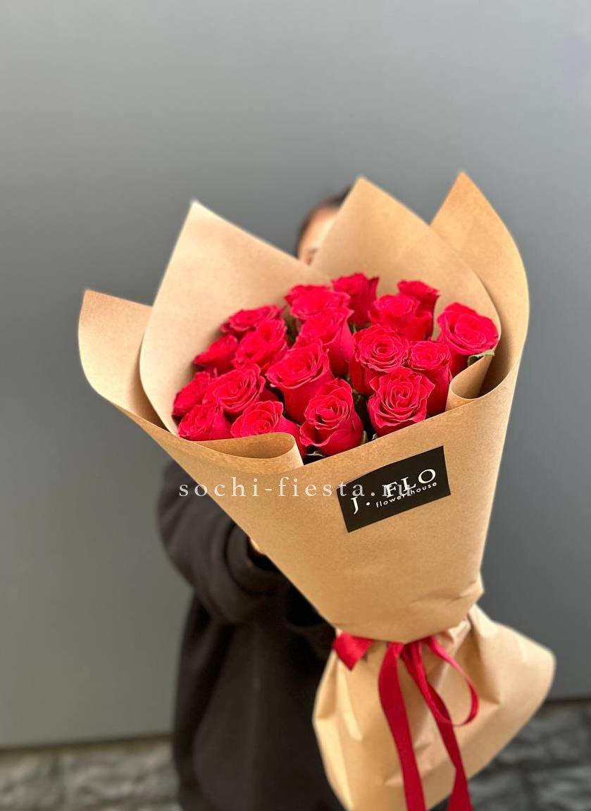 Compliment — это двадцать пять красных роз на длинных стеблях, собранных в классическую форму. Букет держит форму несколько дней и остаётся аккуратным даже в высокой вазе.