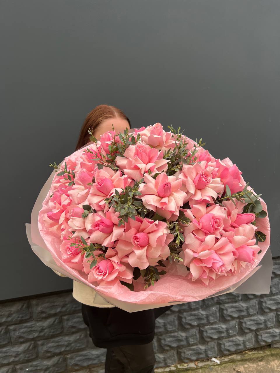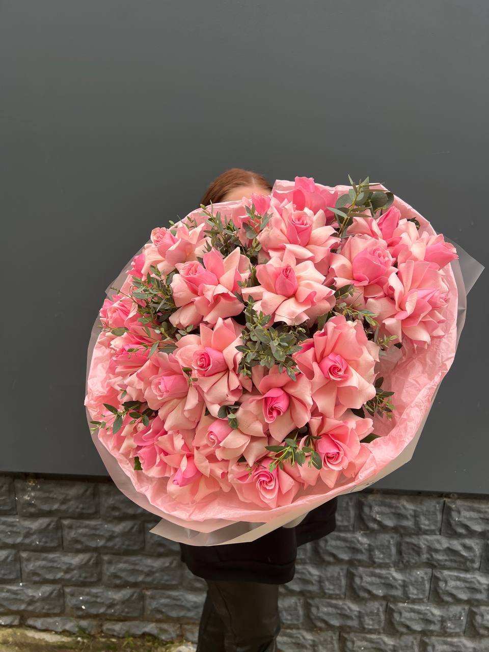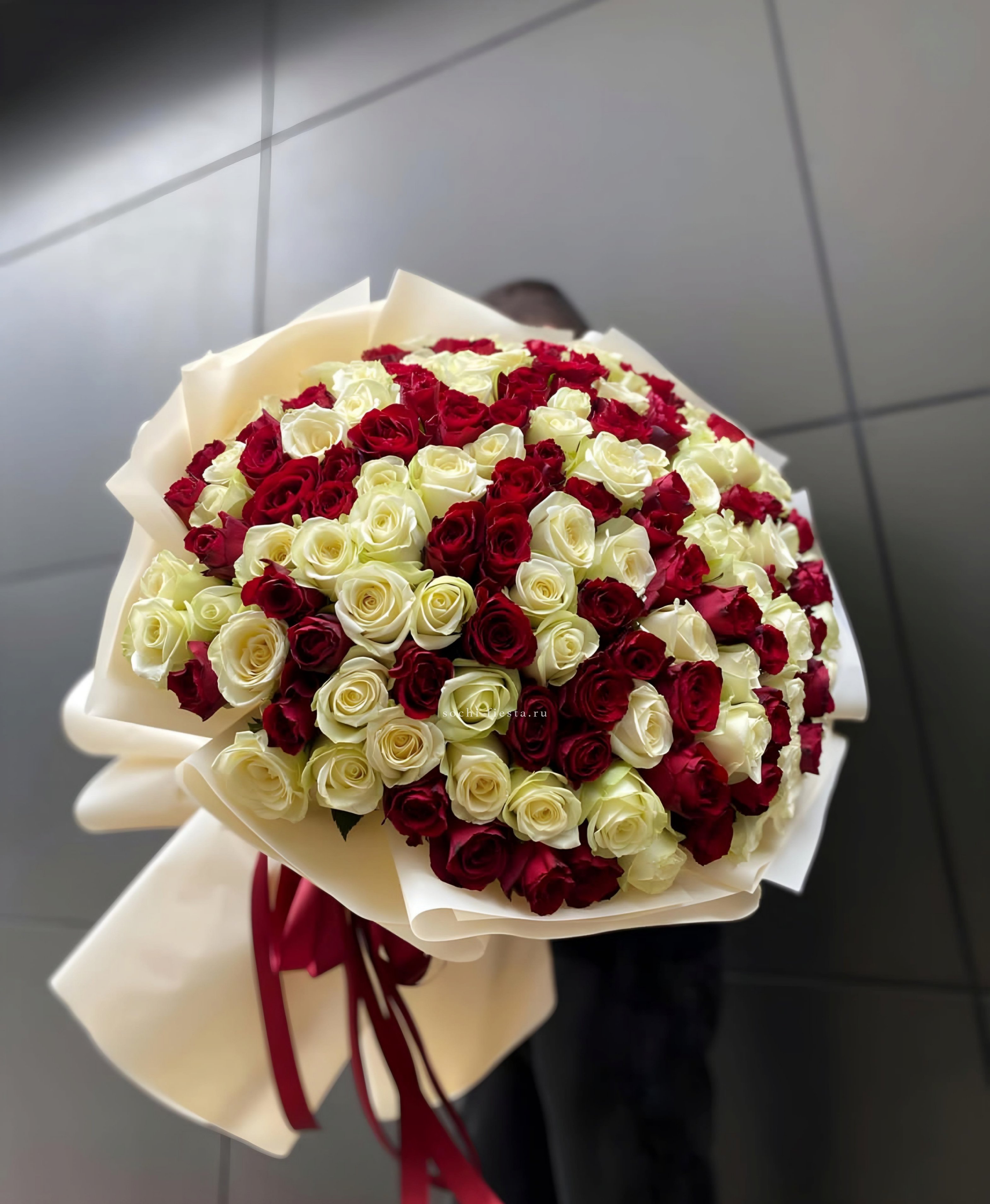 Compliment — это двадцать пять красных роз на длинных стеблях, собранных в классическую форму. Букет держит форму несколько дней и остаётся аккуратным даже в высокой вазе.