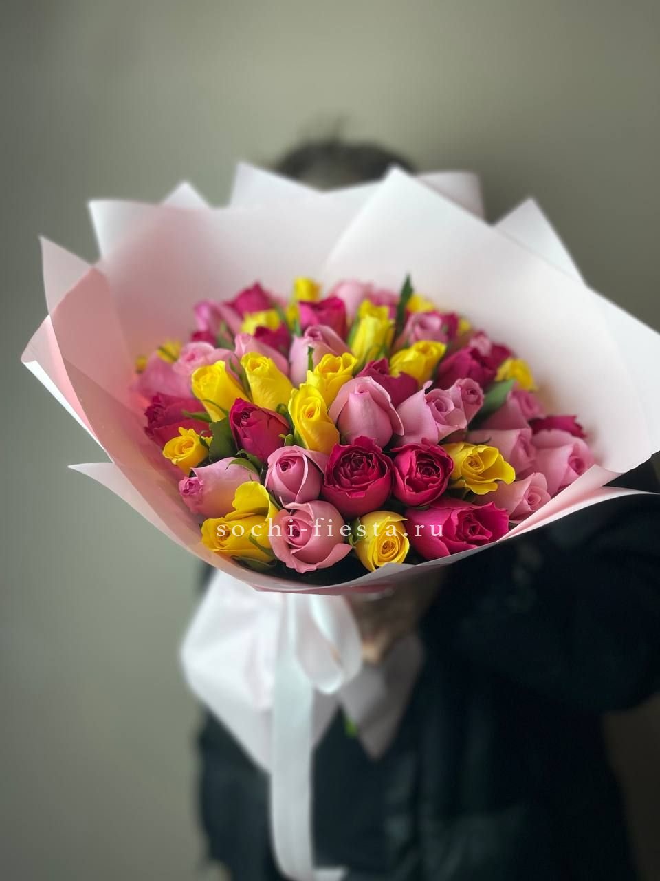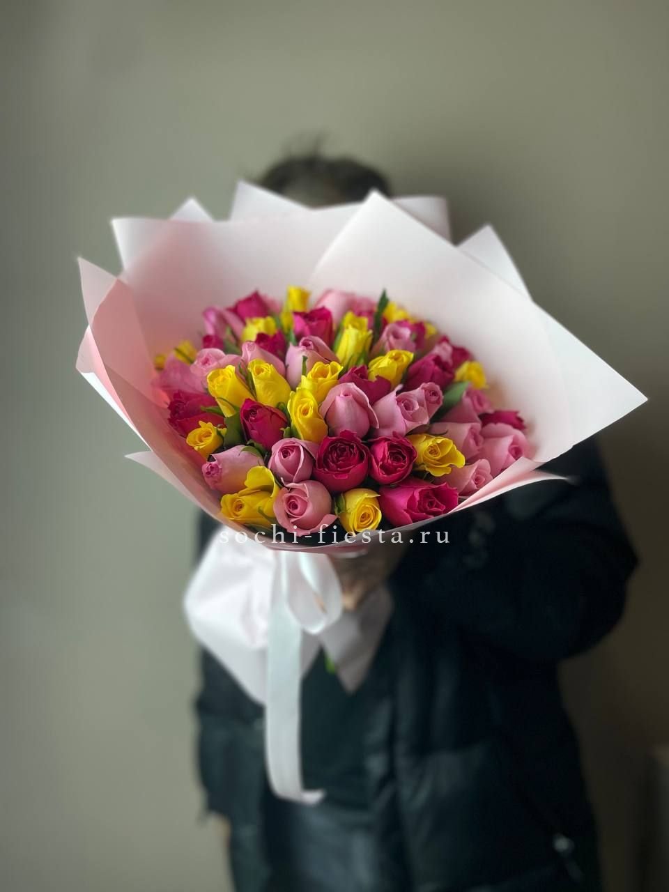 Пятьдесят один бутон в разных оттенках — от насыщенных до приглушенных — выстраиваются в плотную шапку. Кенийские розы компактны и стойки, букет удобно разместить в любой вазе.