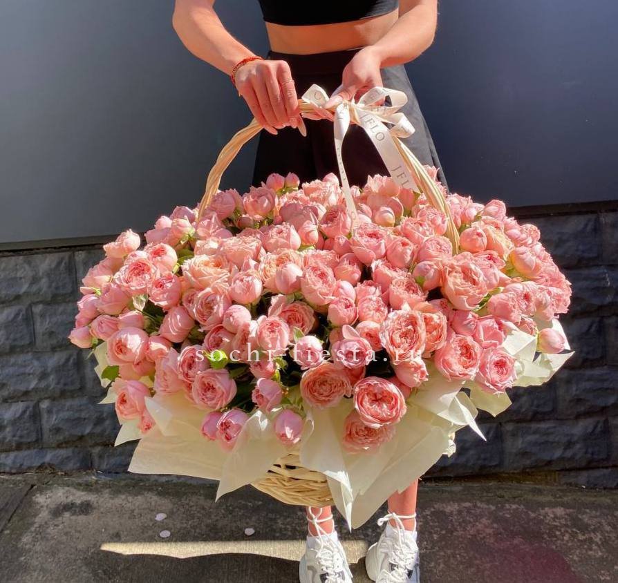 яркая корзина из 101 кустовой пионовидной розы сорта.