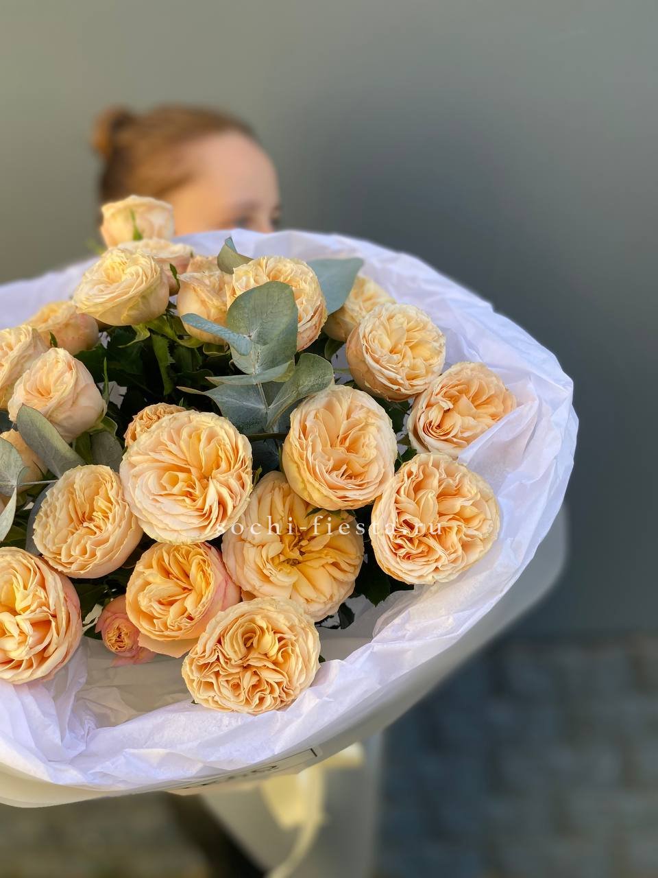на фото 7 кустовых роз с эвкалиптом.