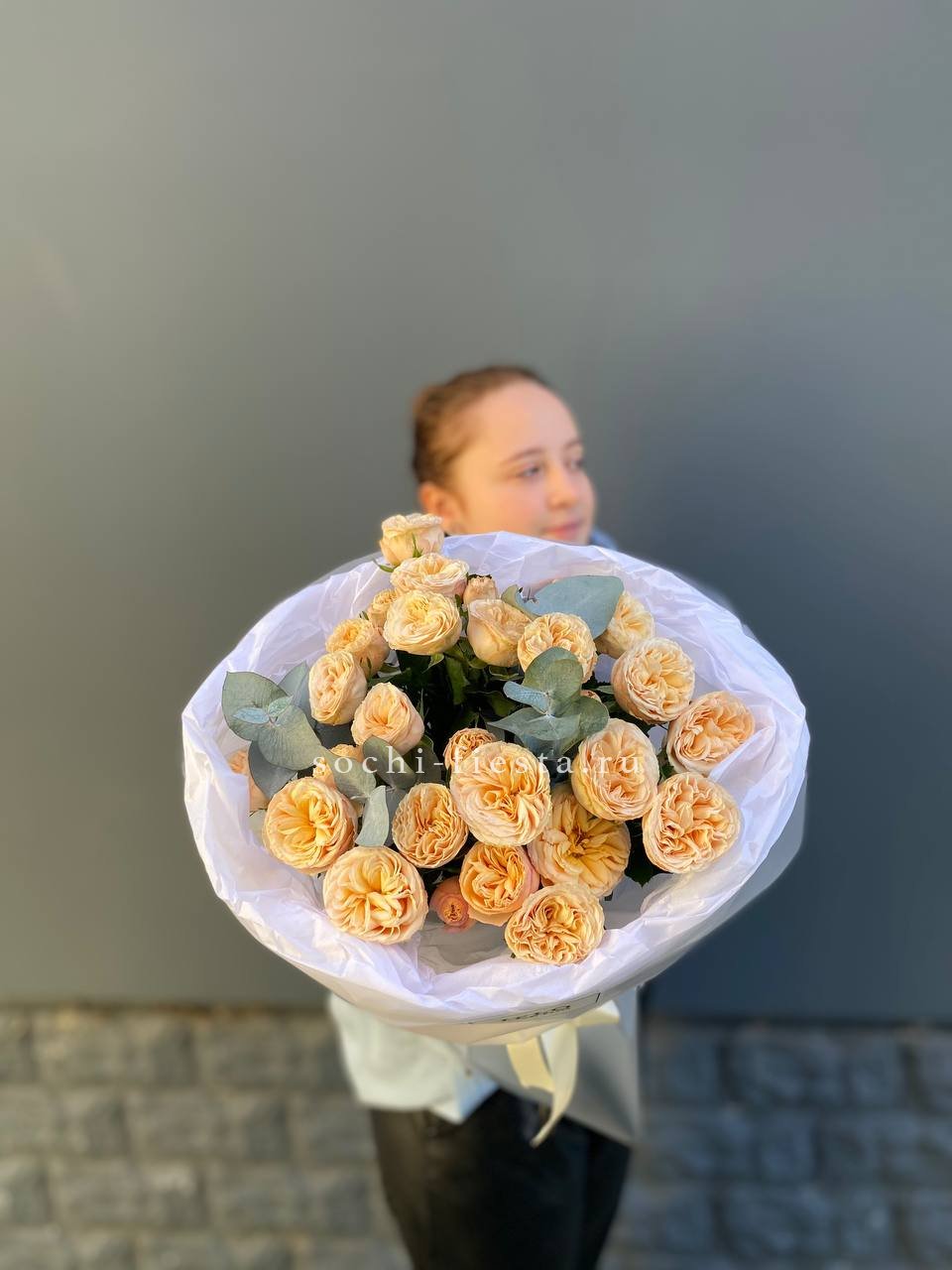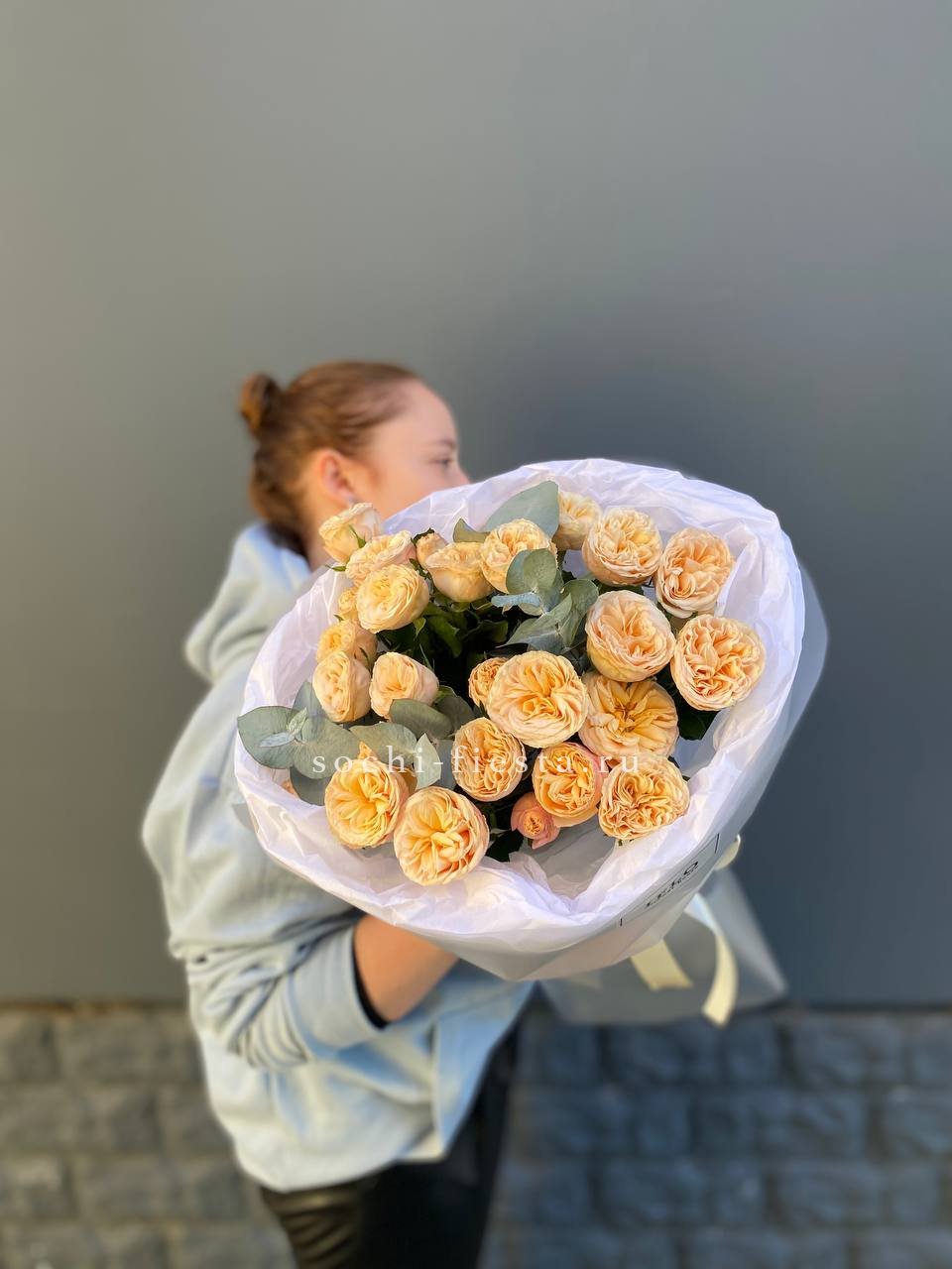 Семь кустовых роз с ветками эвкалипта создают лёгкую композицию, где зелень обрамляет каждый бутон и добавляет воздуха между цветами. Простая сборка с естественным ритмом и свежим характером.