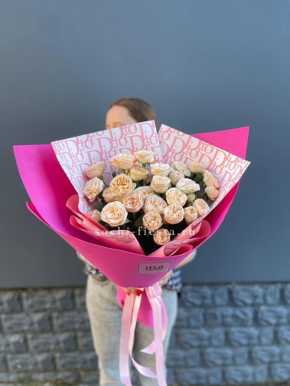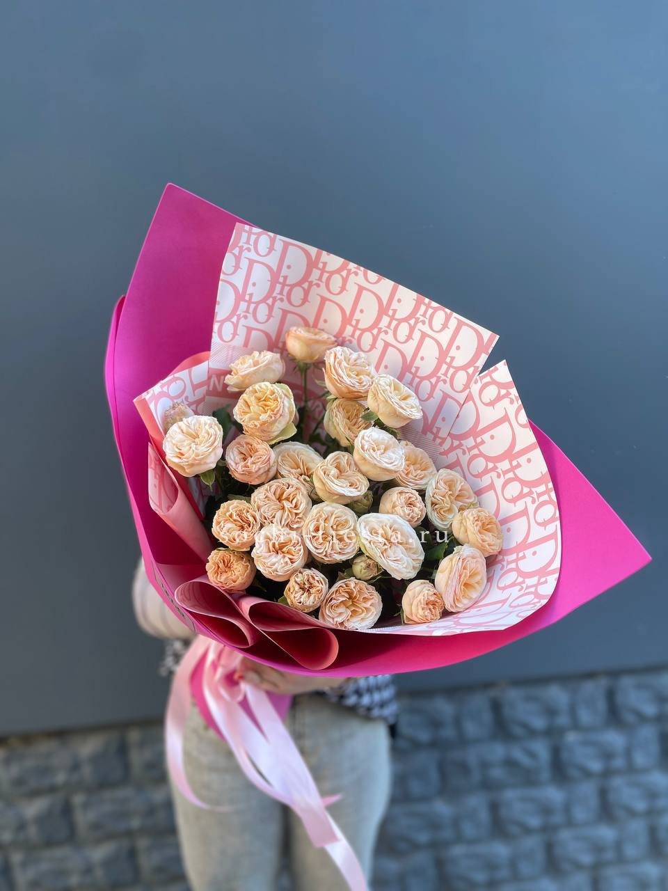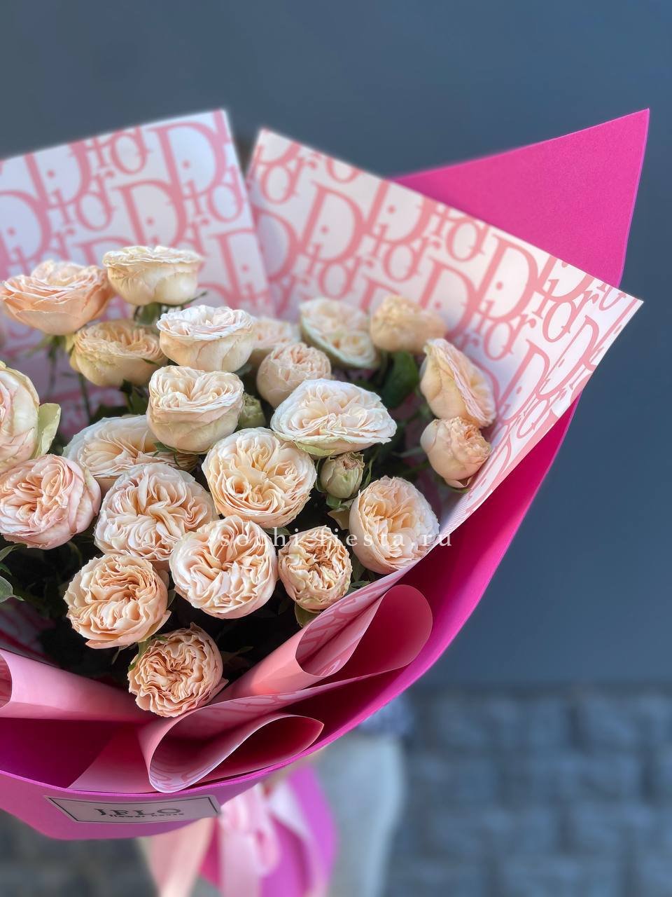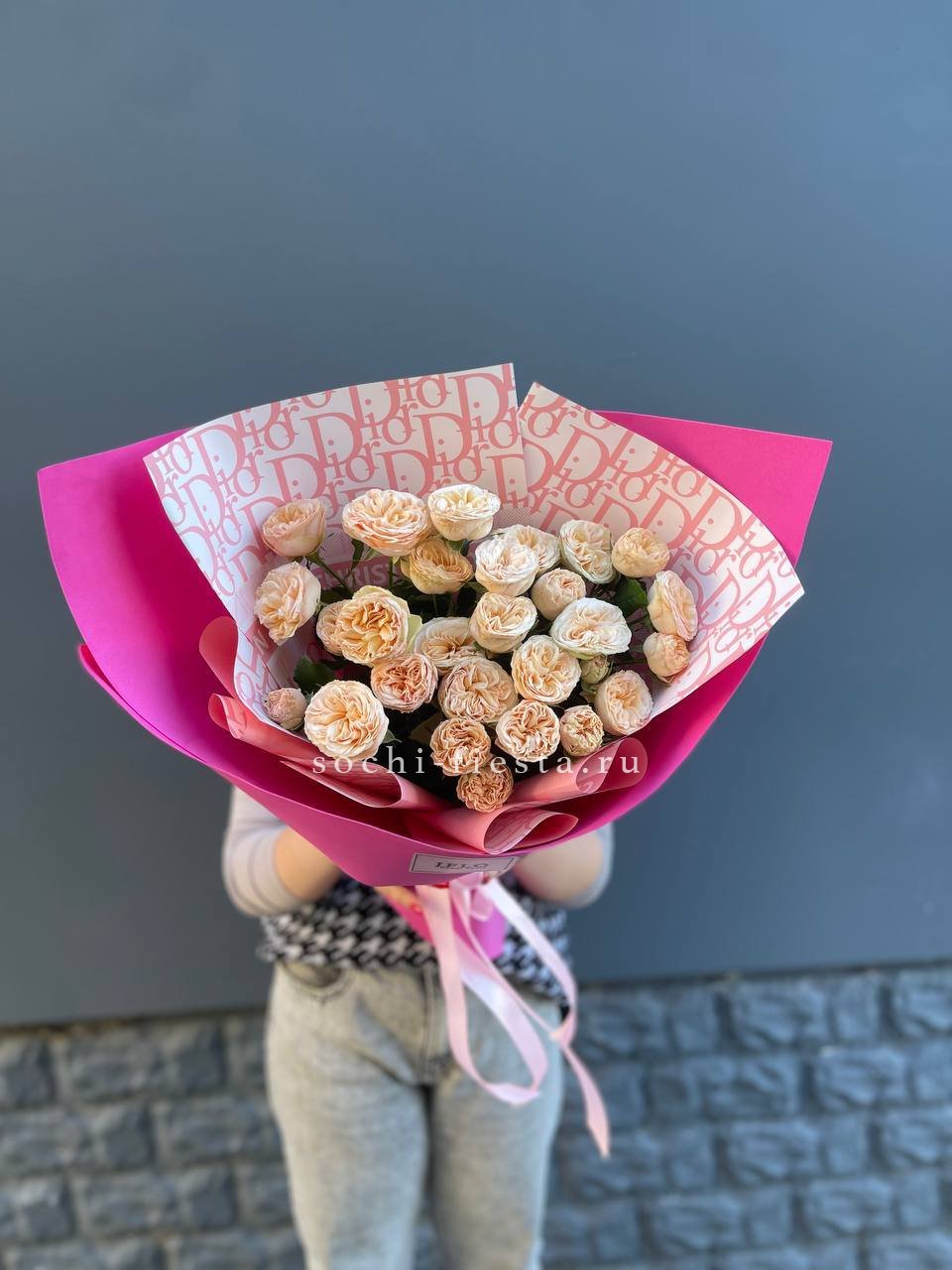 Девять пышных бутонов с многослойными лепестками собраны в округлую композицию. Каждый цветок раскрывается постепенно, создавая объёмную текстуру и живую динамику. Букет выглядит самодостаточно и свежо в любом пространстве.