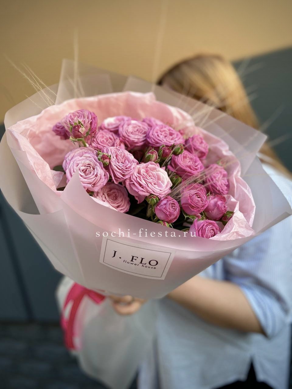 розовые кустовые розы 5 шт., лента, дизайнерская пленка комбинированная.