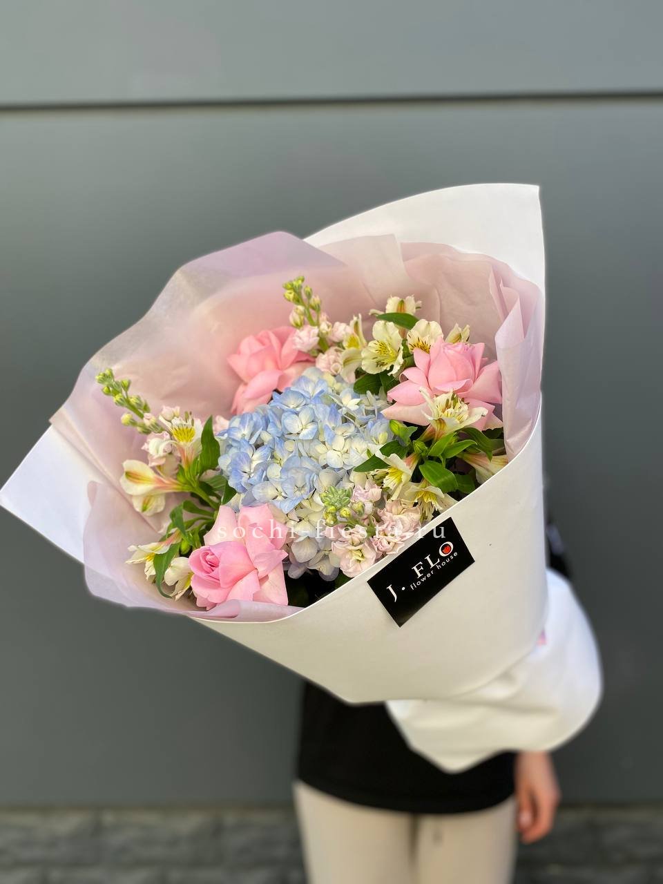 Воздушная композиция в кремовых и белых тонах собрана из нескольких видов цветов с разной формой бутонов. Эустома и диантусы создают мягкую текстуру, а кустовые розы добавляют объём и завершённость силуэту.