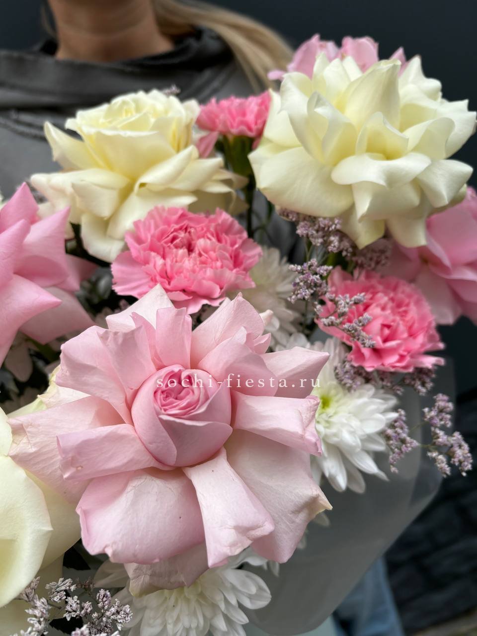маттиола, розы, гортензия, диантусы, хризантемы , лента и дизайнерская пленка.