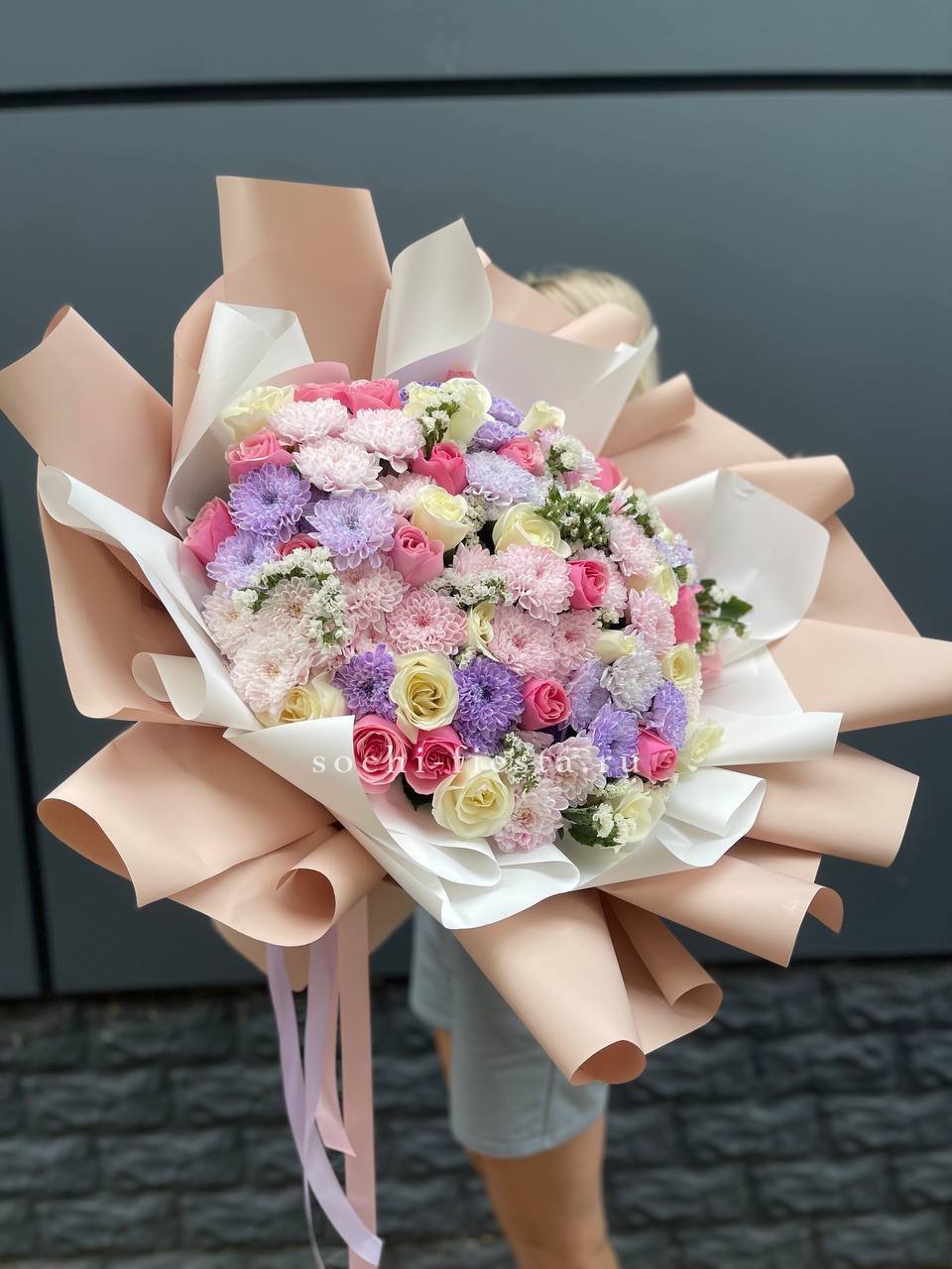 Авторская работа с плотным наполнением и выразительной палитрой. Розы и хризантемы образуют многослойную структуру, где каждый бутон раскрывается в своём ритме.