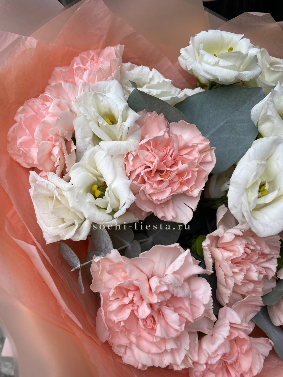 Воздушные диантусы персикового оттенка раскрываются пышными шапками среди нежной эустомы. Ветви эвкалипта придают букету свежесть и легкую графичность.