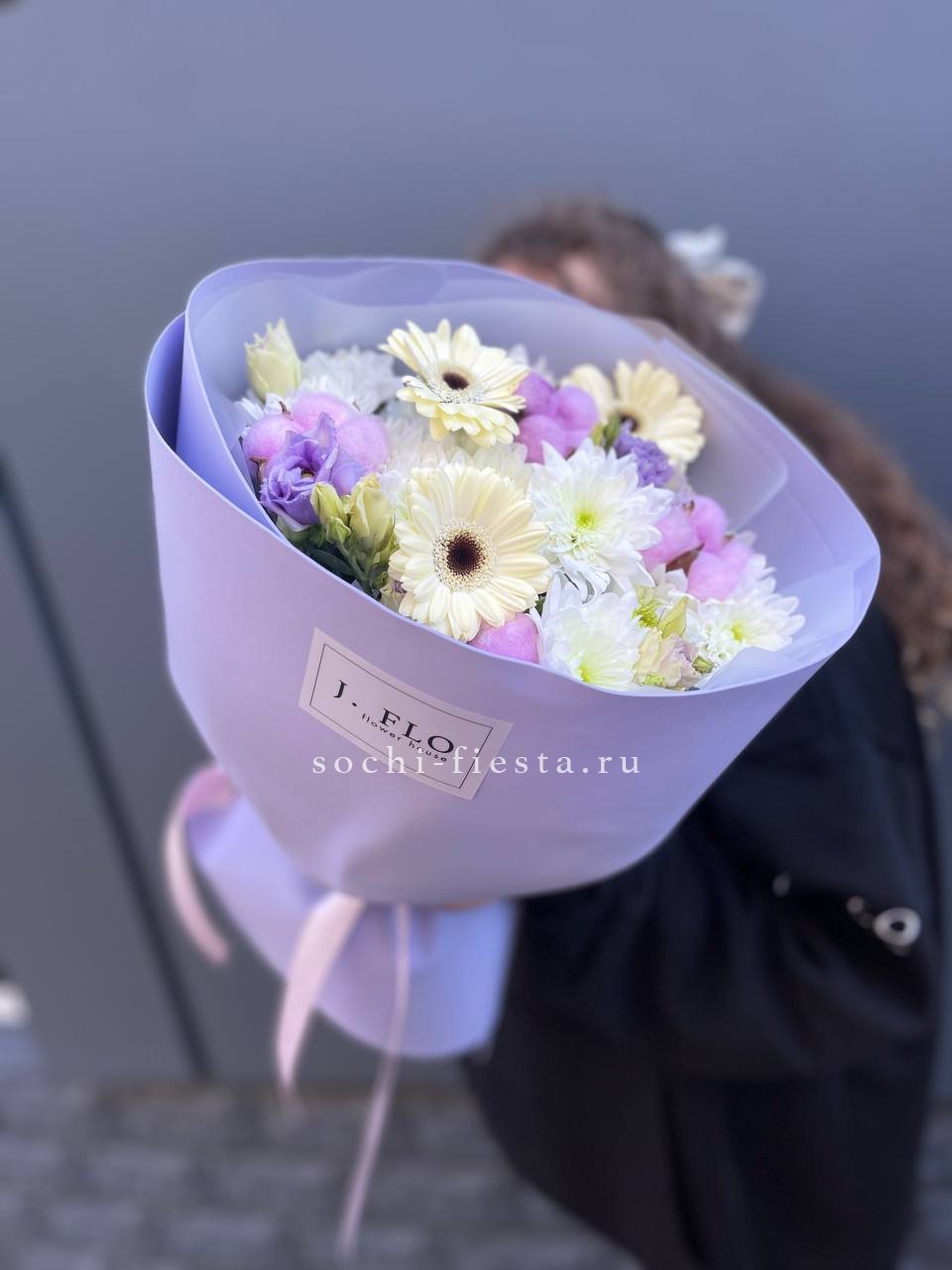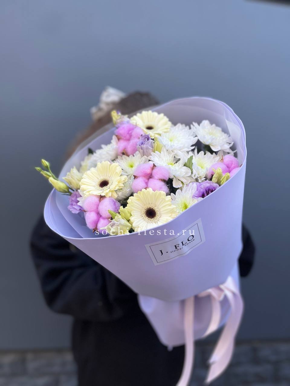 Воздушные соцветия эустомы переплетаются с яркими головками диантусов, создавая живую графику в обёртке. Каждый бутон раскрывается по-своему, добавляя композиции объём и движение. Букет для тех, кто ценит свежесть без лишних деталей.
