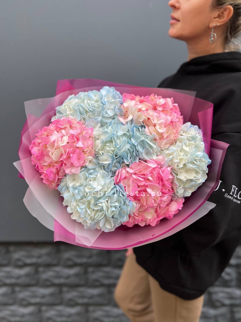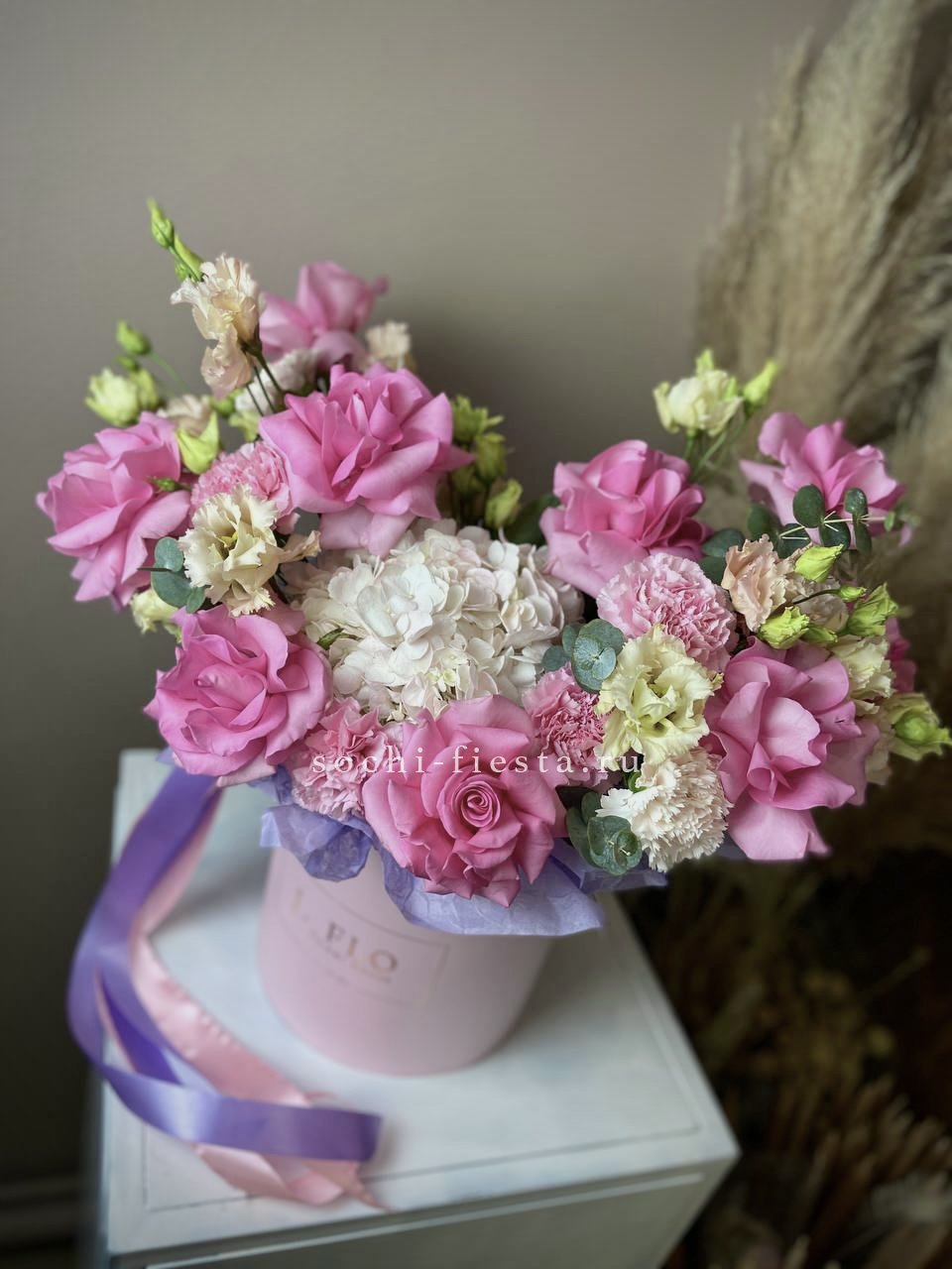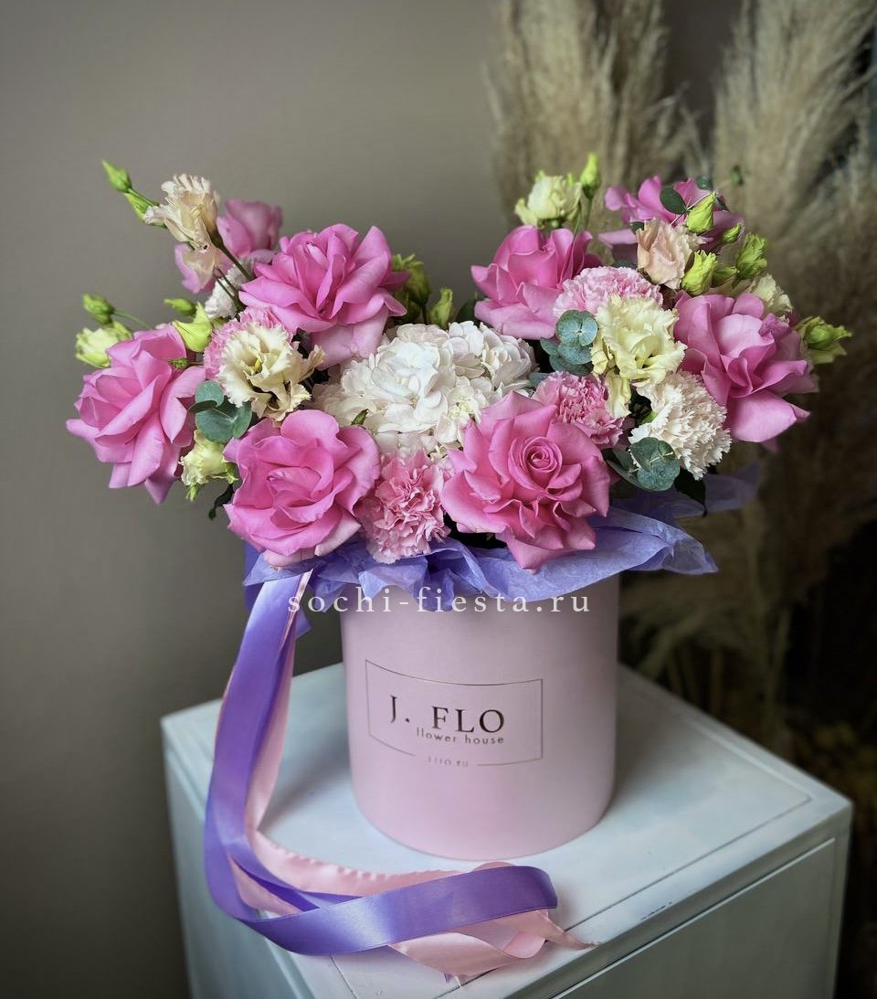 Пышные розы и бомбастик образуют округлую форму с мягкими переходами. Диантус заполняет промежутки между крупными бутонами, а эвкалипт добавляет воздушности композиции.