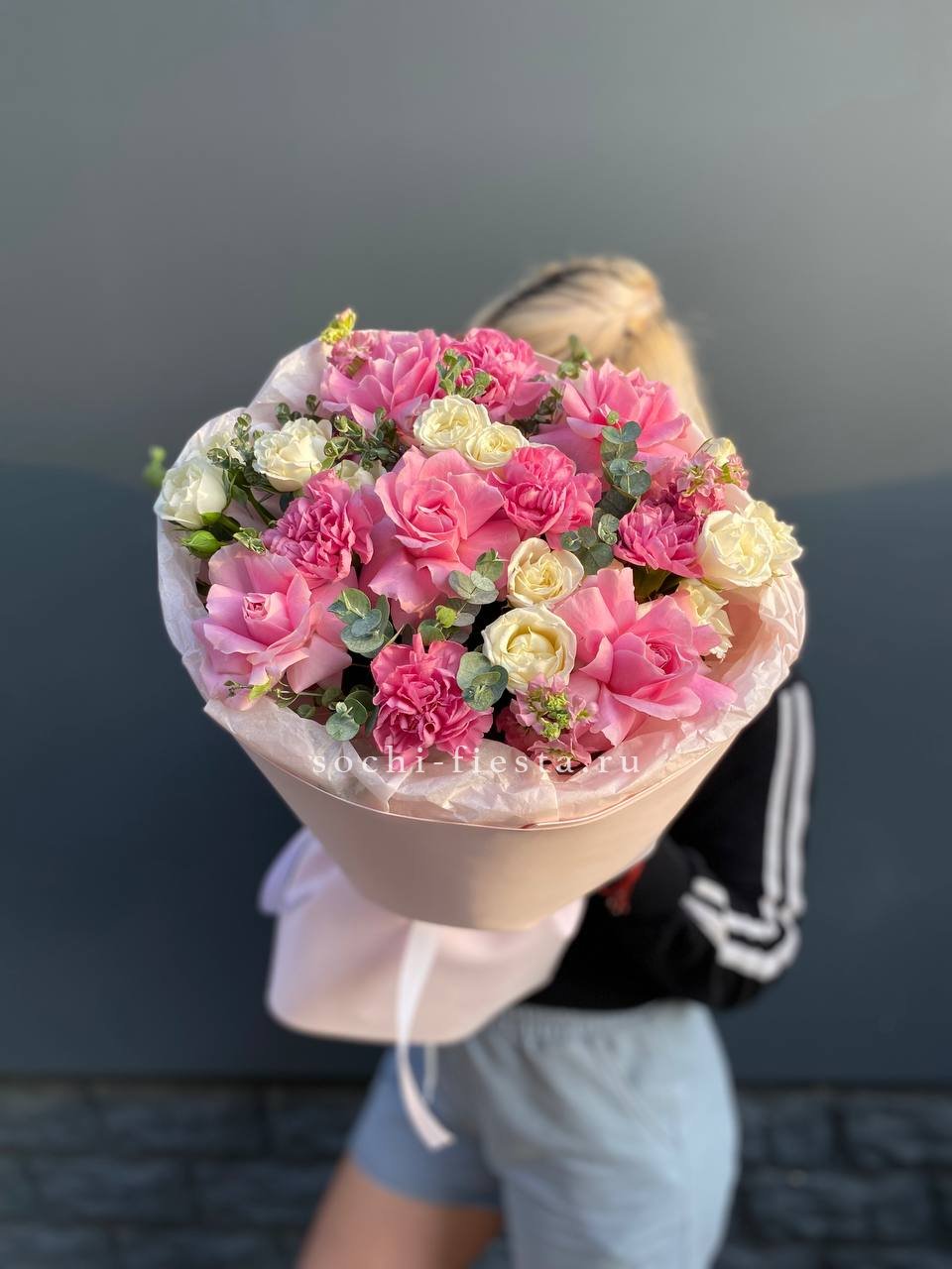 Розовые розы и диантусы окружены пышными соцветиями маттиолы и бомбастика. Композиция собрана плотно, каждый цветок поддерживает соседний, создавая объемную округлую форму. Букет держит силуэт и выглядит цельно с любого ракурса.