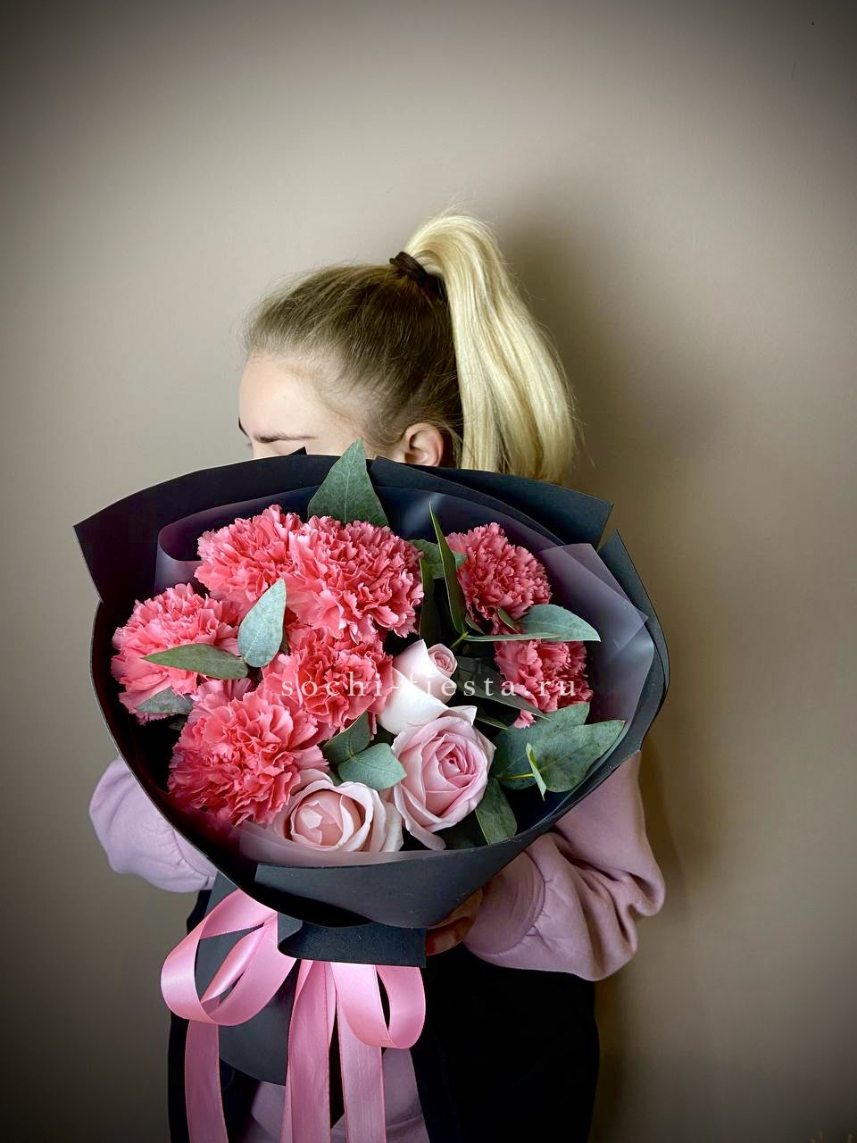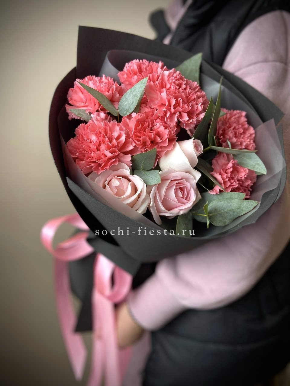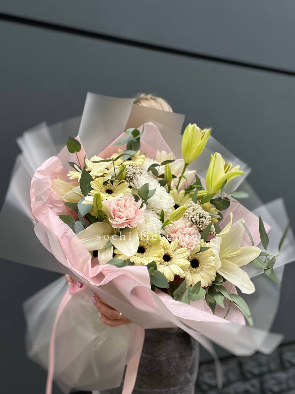 Сочные герберы и лилии образуют яркое цветовое пятно среди диантусов и хризантем. Композиция напоминает о летнем саде, где краски переплетаются свободно и естественно.