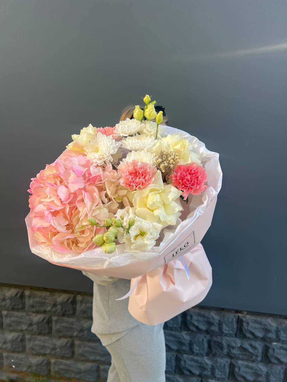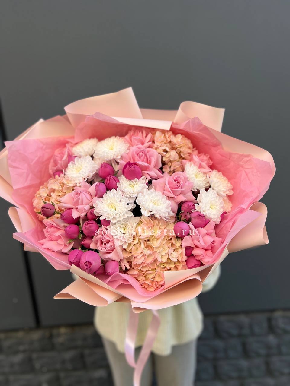 хризантема кустовая, гортензия, мисти баблс, розы в нежном оформлении.