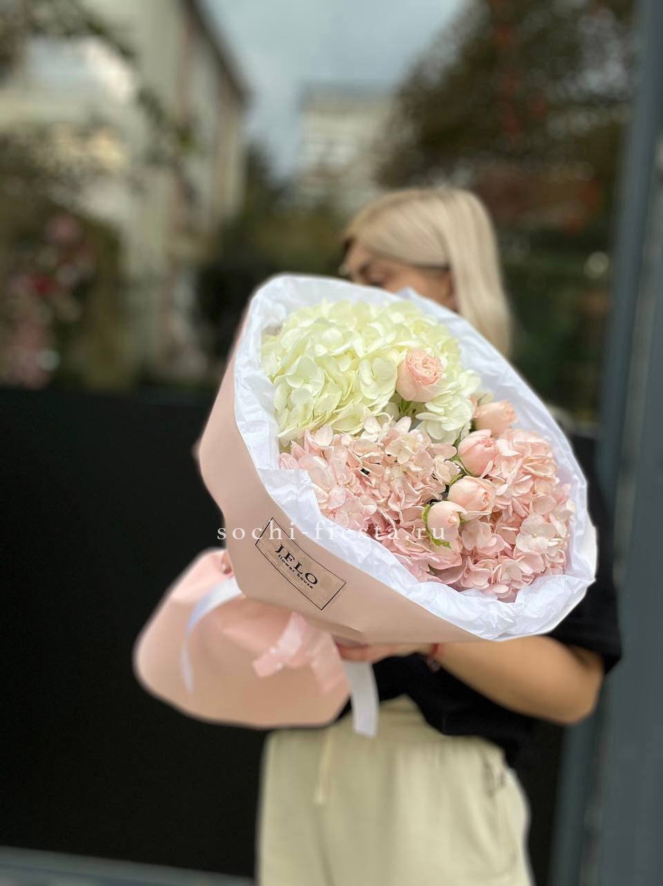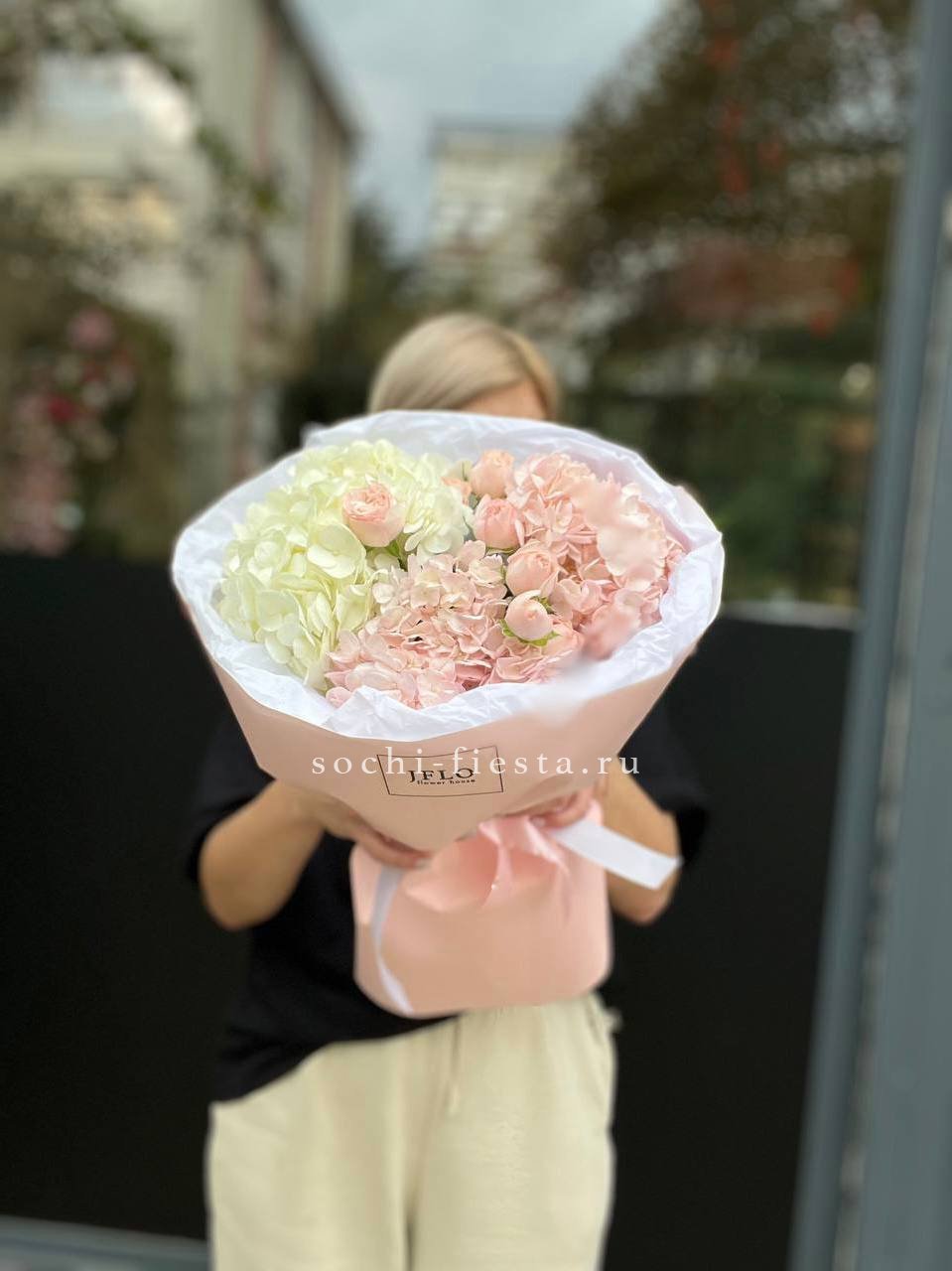 Пастельная гамма с мягкими переходами от кремового к пудровому создаёт спокойное цветовое звучание. Кустовые розы и хризантемы дополнены воздушным лагурусом, который добавляет композиции лёгкости.