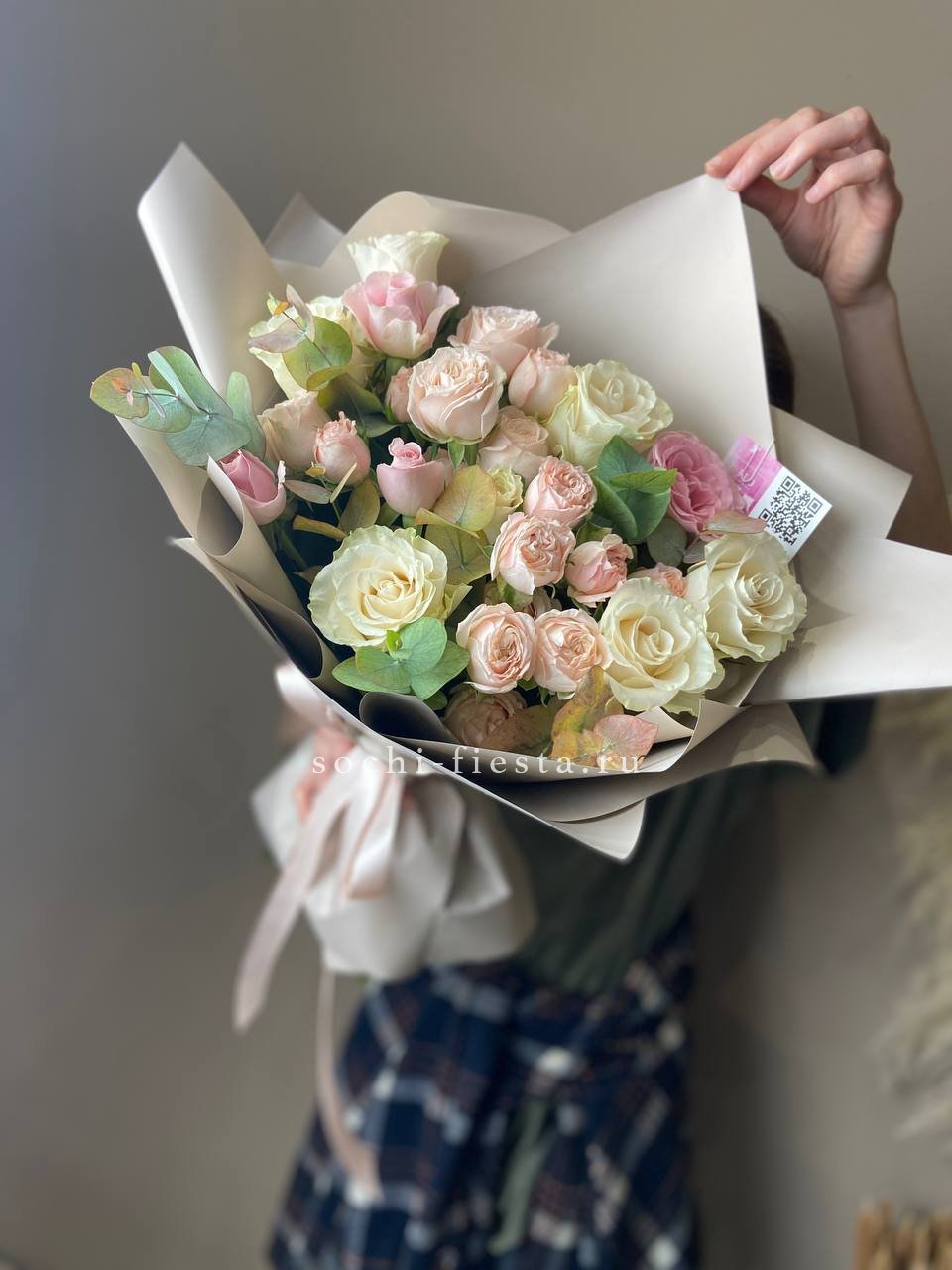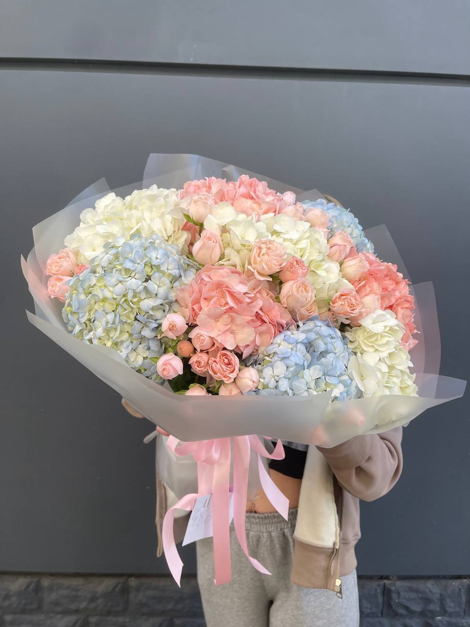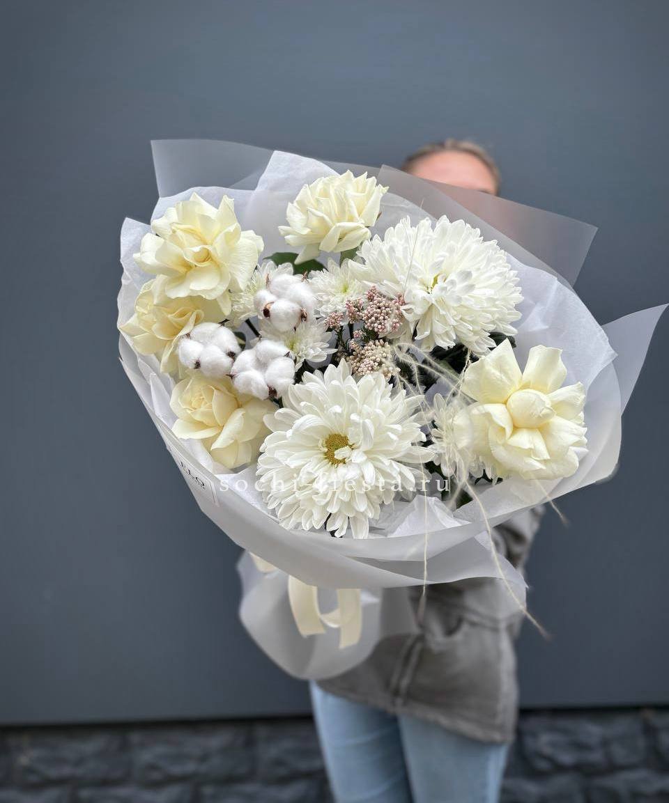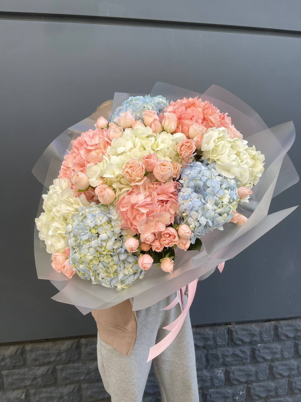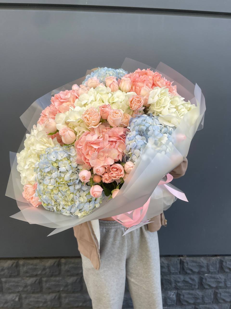 Этот пышный авторский букет напоминает нежное зефирное облако, в котором гармонично сочетаются объемные формы и изысканные оттенки. Композиция представляет собой микс из крупных соцветий гортензии и кустовых роз в пастельной гамме.
