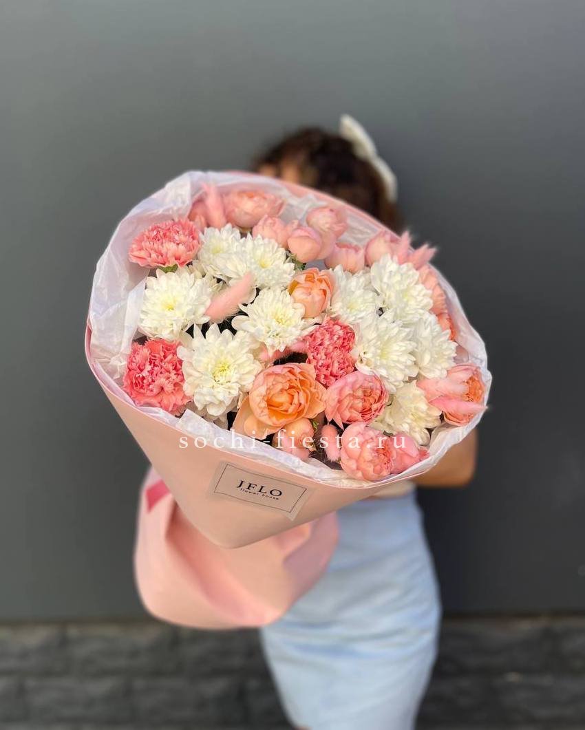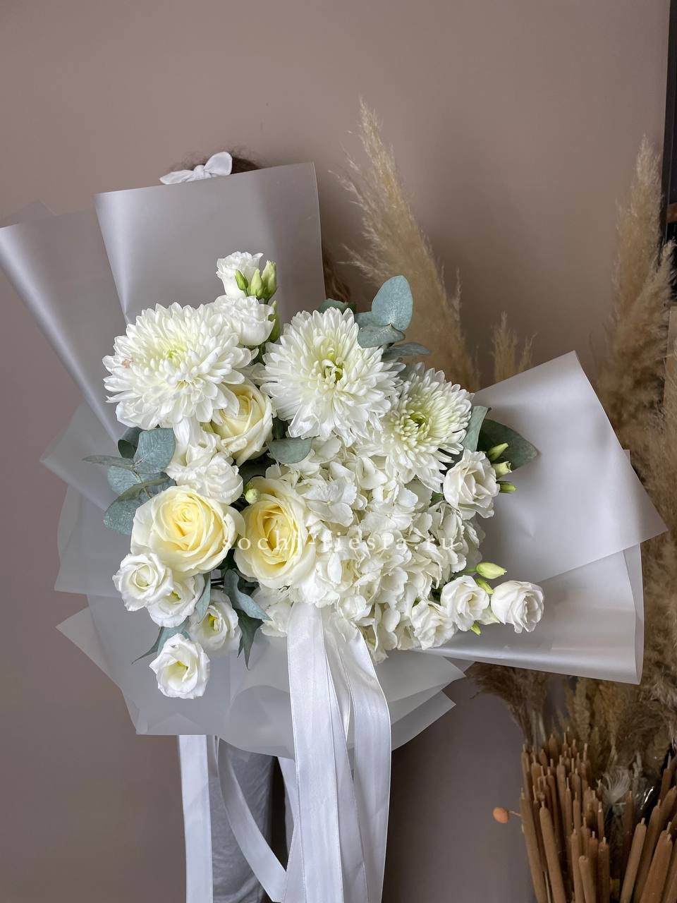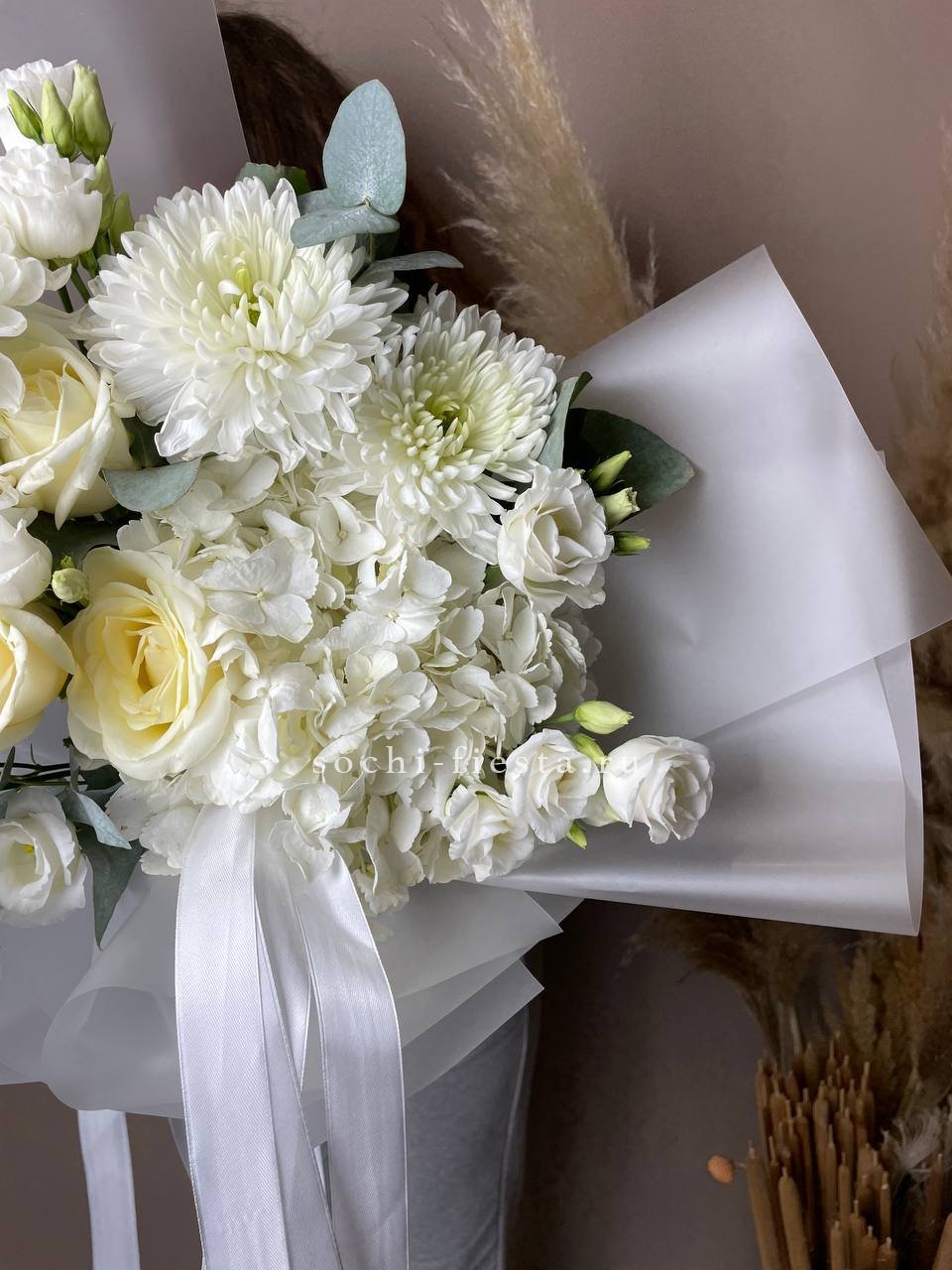 Кустовая хризантема и маттиола образуют гармоничную пару с разной фактурой бутонов. Эвкалипт добавляет свежести и завершает композицию естественными линиями.