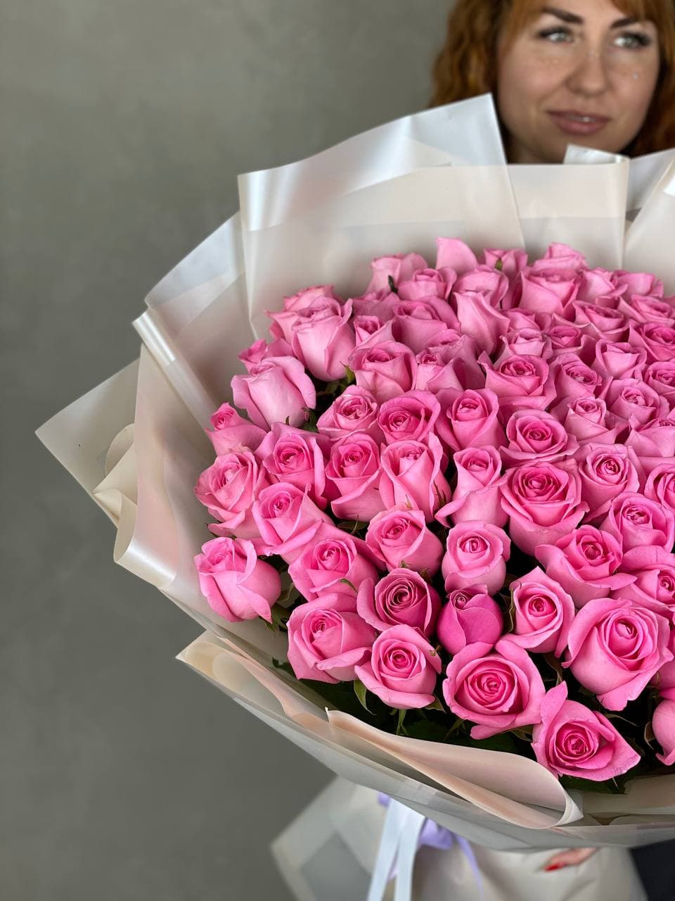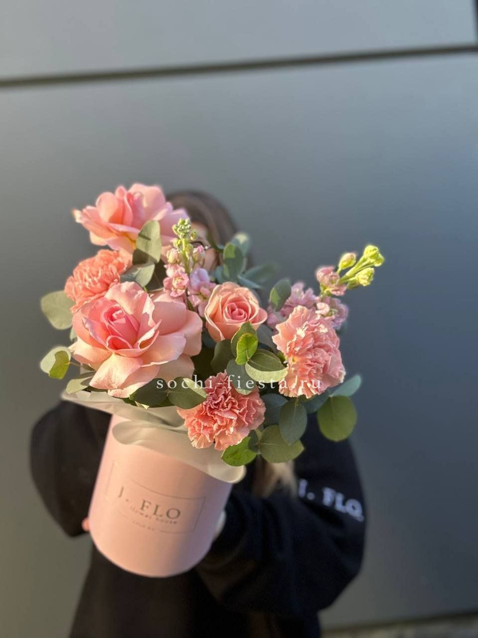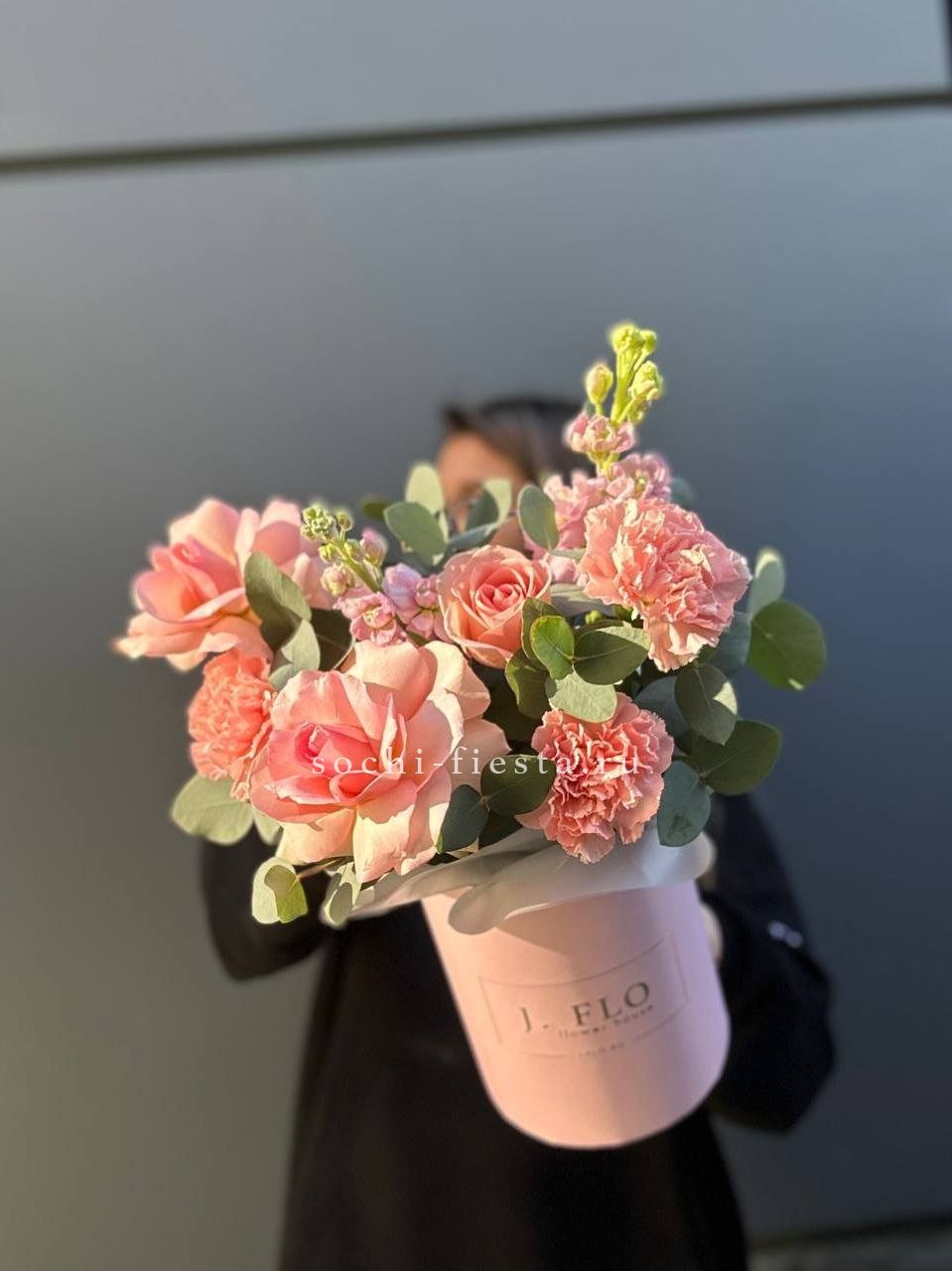 Кустовая хризантема и маттиола образуют гармоничную пару с разной фактурой бутонов. Эвкалипт добавляет свежести и завершает композицию естественными линиями.