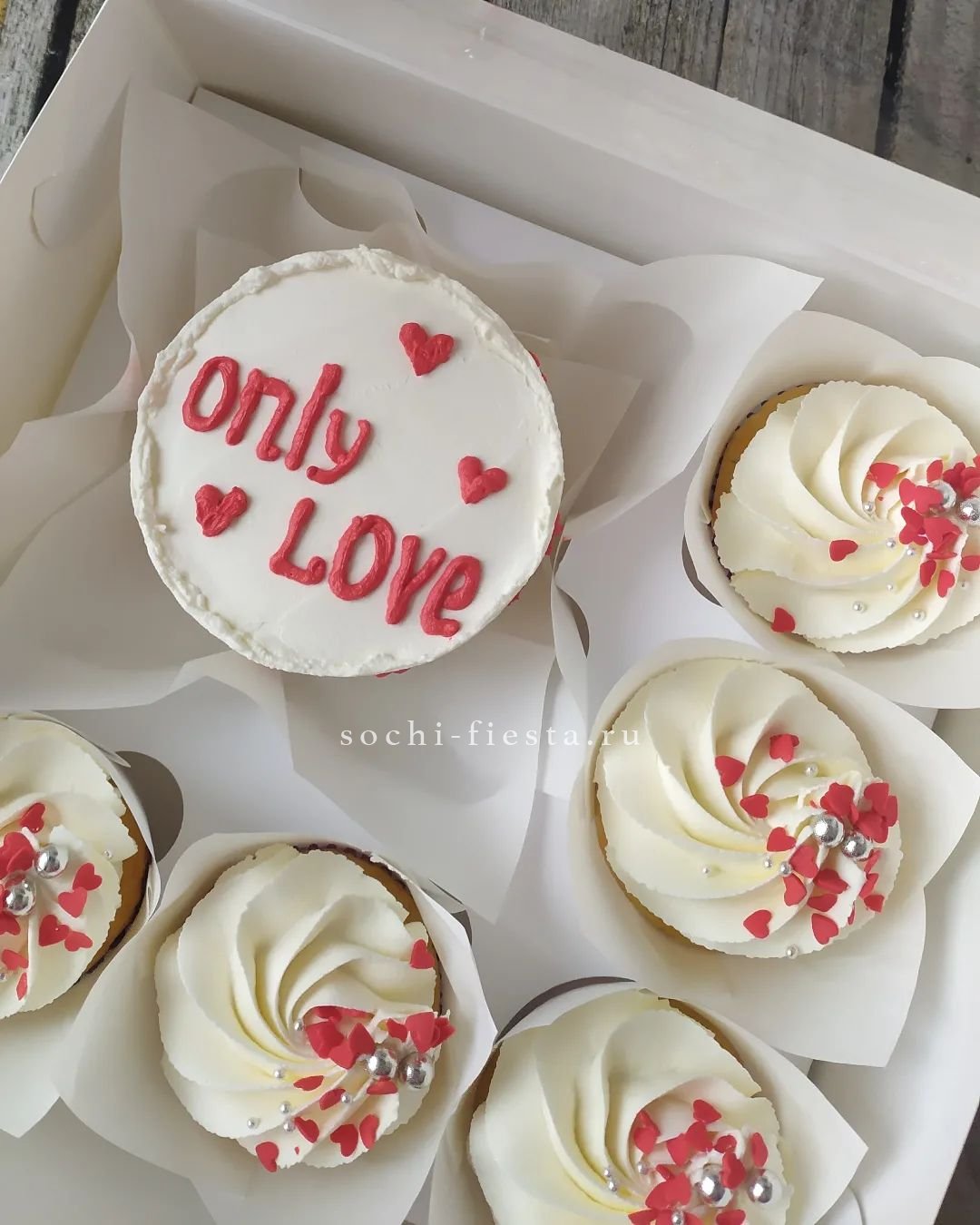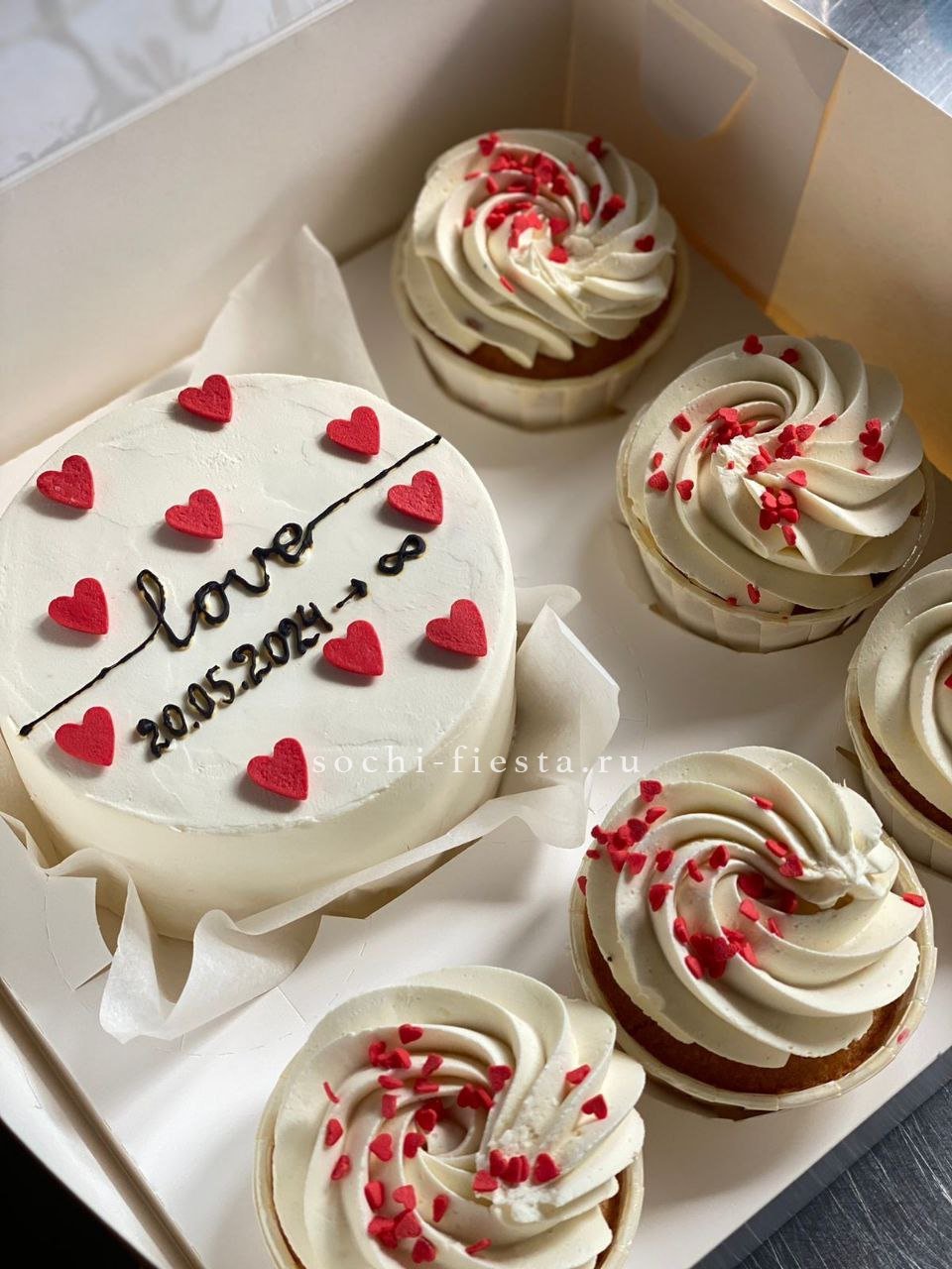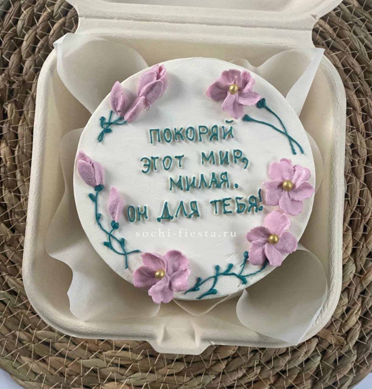 Три слова на поверхности торта говорят без лишних объяснений. Крем и декор создают завершенную картинку в формате персональной порции. Начинка на выбор делает момент еще приятнее.